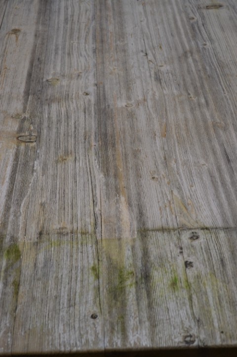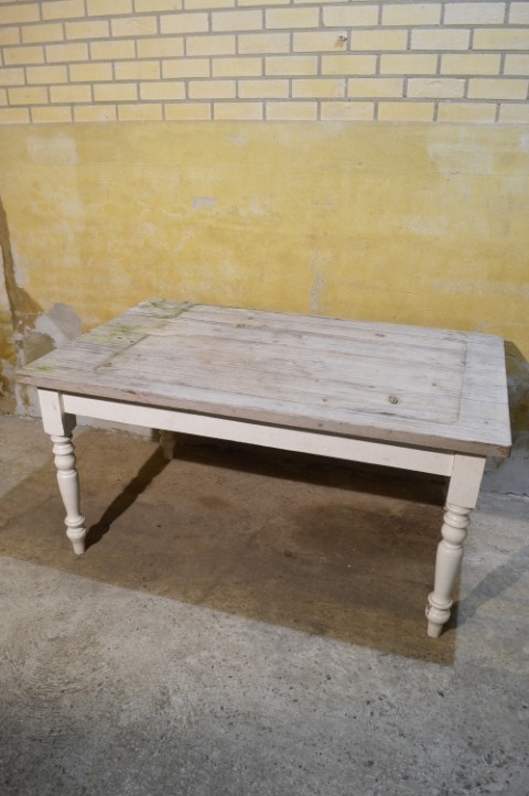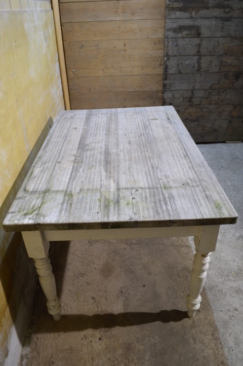 De tafel is tweedehands en vertoont gebruikssporen. De poten zijn demontabel en het blad is verweerd.