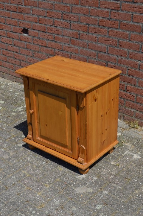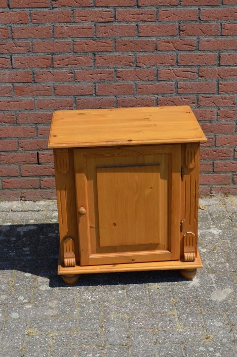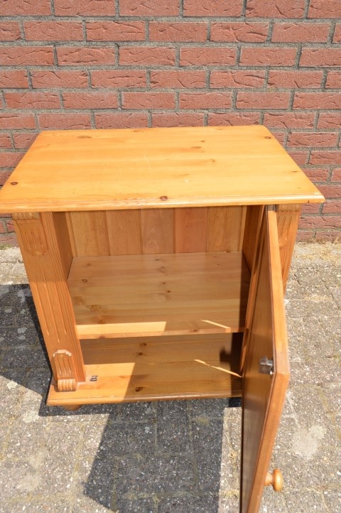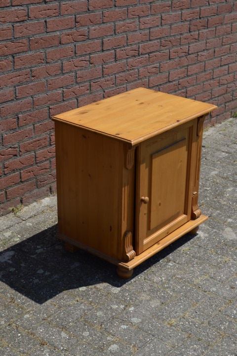 Klein grenenhouten kastje met 1 deur met een sierlijke eenvoud, voor in de woonkamer als bijzettafeltje tussen twee fauteuils. Of als bijzetkastje om een plant op te zetten of een mooie decoratie. In de slaapkamer als nachtkastje of in de hal als bijzetkastje waar de handschoenen prachtig in passen. Binnenin is het schap verstelbaar in hoogte.
