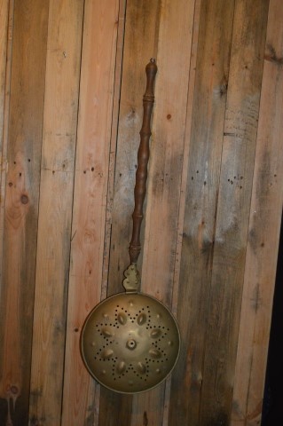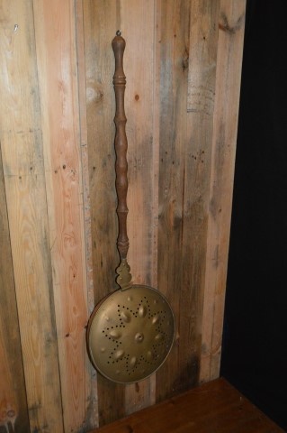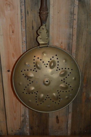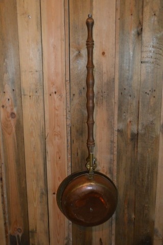 Deze vintage bedstoof, ook wel beddenpan genoemd, is voorzien van een fraai gevormde eikenhouten steel. De pan is gemaakt van roodkoper en afgesloten met een deksel van geelkoper, voorzien van kleine ventilatiegaatjes. Vroeger werd dit gebruiksvoorwerp ingezet om het bed te verwarmen in koude winters, nog vóór de tijd van warmwaterkruiken. De pan werd gevuld met hete stenen, heet water of gloeiende kooltjes en voorzichtig tussen het beddengoed geplaatst. Tegenwoordig is deze bedstoof vooral een decoratief en nostalgisch object dat perfect past in een landelijk of brocante interieur.