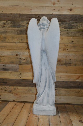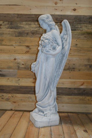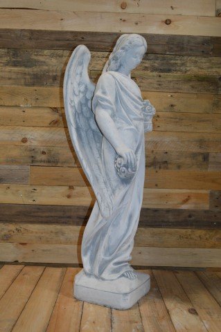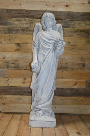 Dit grote betonnen engelbeeld toont een staande engel die bloemen in de handen draagt. Het is een schitterende decoratie die in de tuin op een opvallende plek prachtig tot zijn recht komt. Ook binnenshuis kan dit beeld een serene uitstraling geven. Daarnaast wordt dit ornament vaak gebruikt als gedenkbeeld of herinnering op een herdenkingsplek. De engel symboliseert rust, bescherming en troost, waardoor dit beeld niet alleen een decoratieve, maar ook een emotionele waarde heeft.