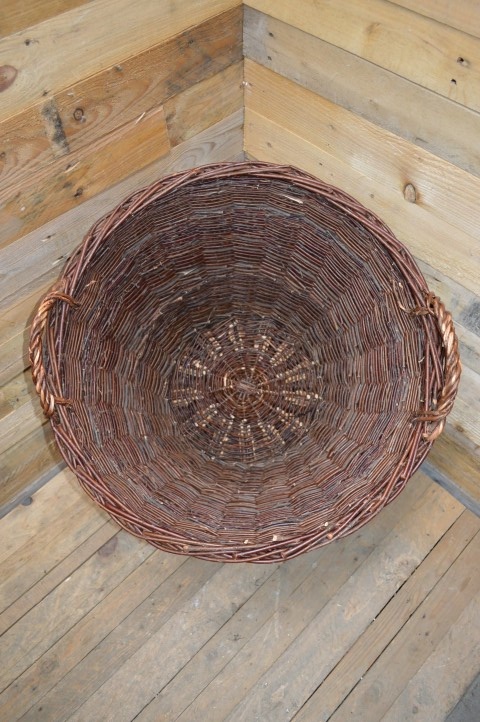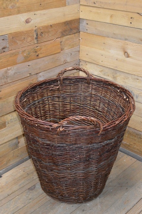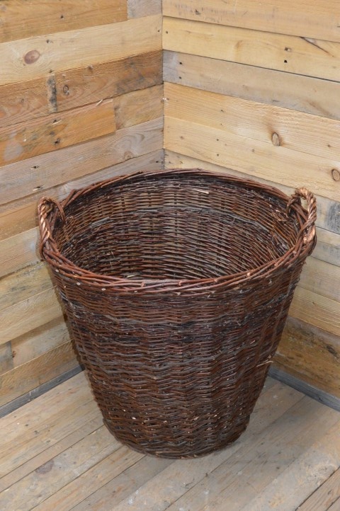 Een zeer grote mand met twee handvatten gevlochten van donkere wilgentenen in de vorm van een houtkorf zoals die in vroeger dagen gebruikt werd. Deze XXL mand is gewoon prachtig als decoratie, door zijn ongewone grote maat. Ook nu nog prima te gebruiken als houtmand of als krantenmand.
