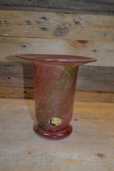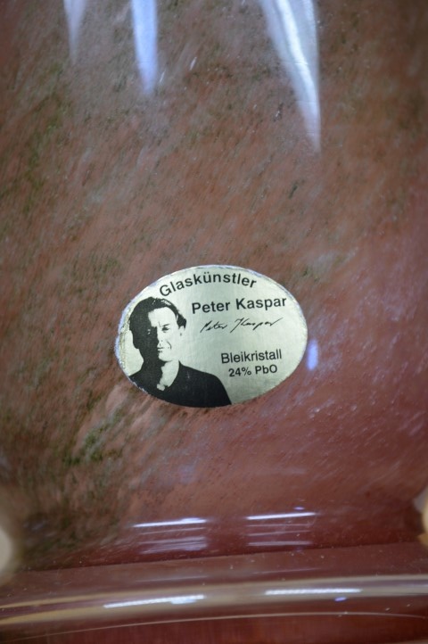 Deze bloemenvaas van kristalglas is geproduceerd door de Duitse glaskunstenaar Peter Kaspar en is met zijn prachtige rode loodglas patronen een echte blikvanger die niet zal misstaan in de woonkamer of eetkamer.