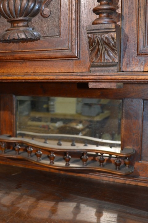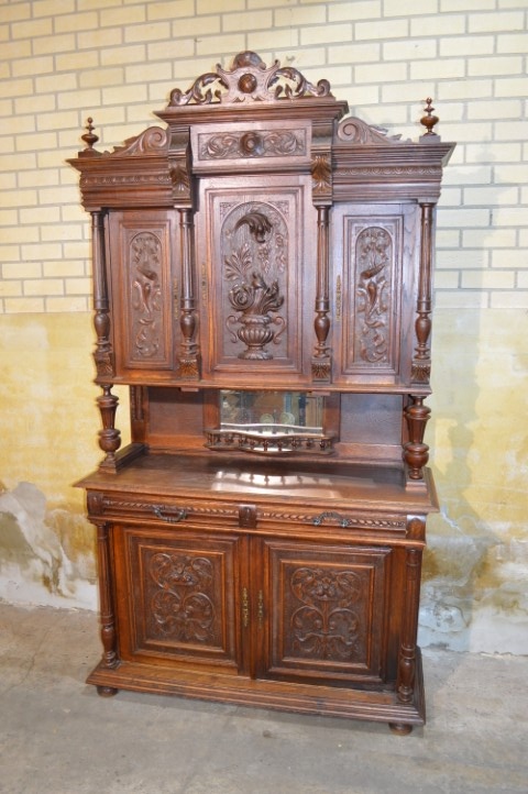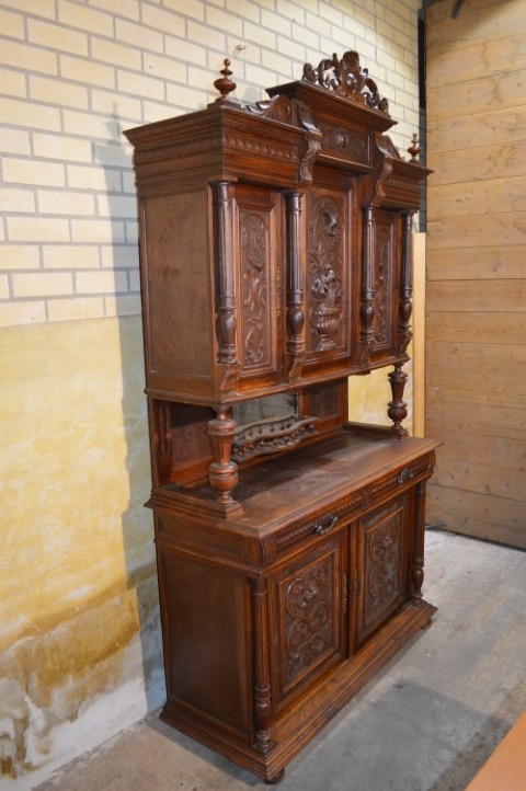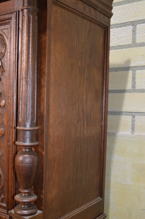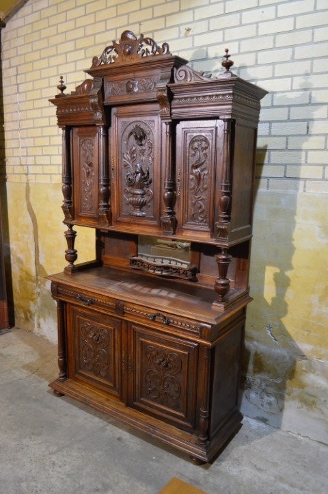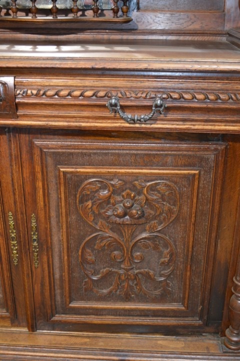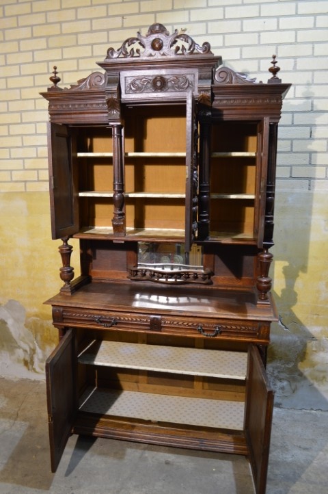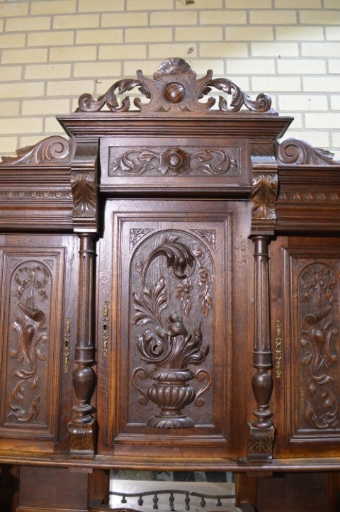 Het houtsnijwerk en de verfijnde details geven het meubel een elegante en karaktervolle uitstraling.