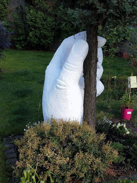 Dit kunstzinnige decoratie ontwerp is gemaakt om bij een boom neer te zetten zodat het lijkt of de hand het boompje omsluit.