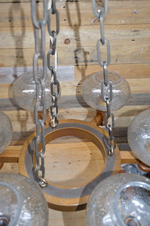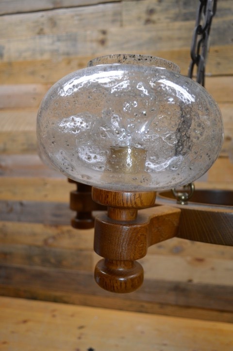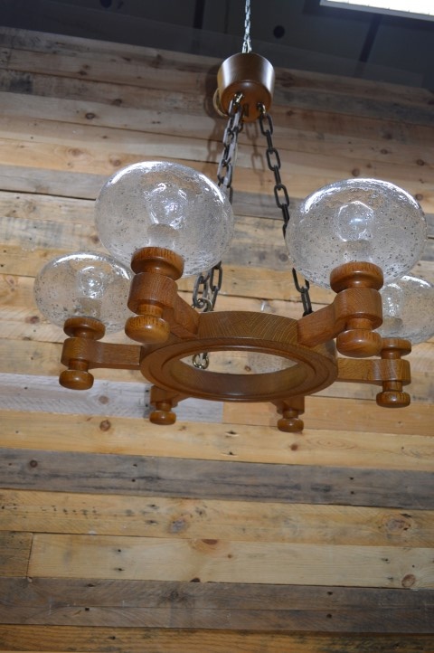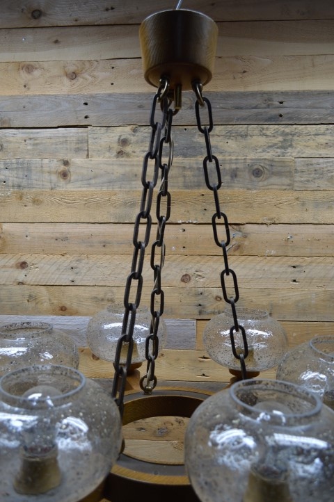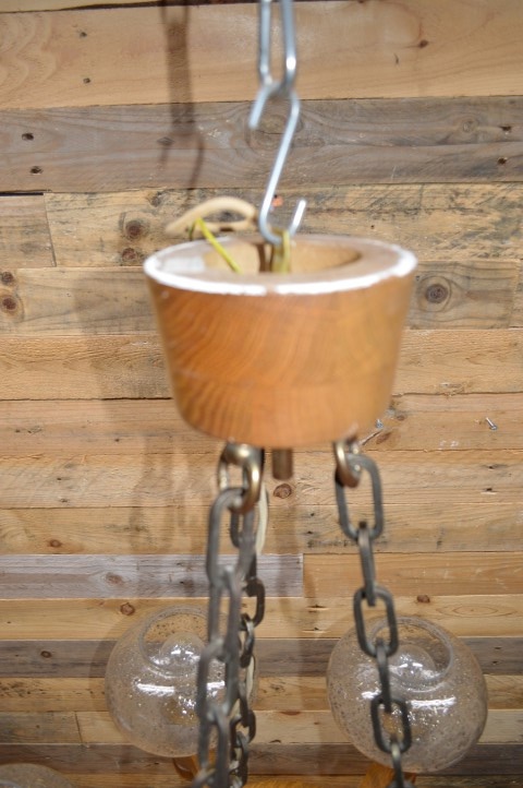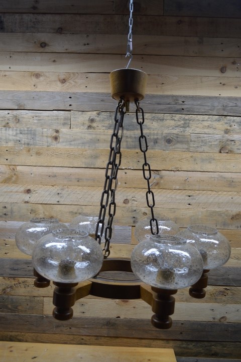 Vintage landelijke eiken hanglamp met zes glazen bollen op te hangen aan een ketting. Een mooie mid century lamp voor boven een eettafel of keukentafel. Een hanglamp waaronder je graag leest of een spelletje doet.