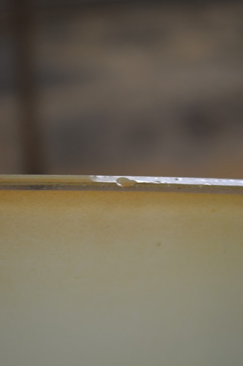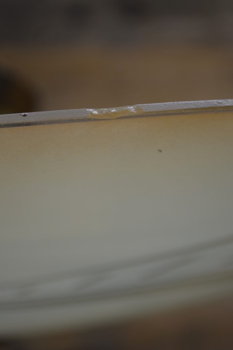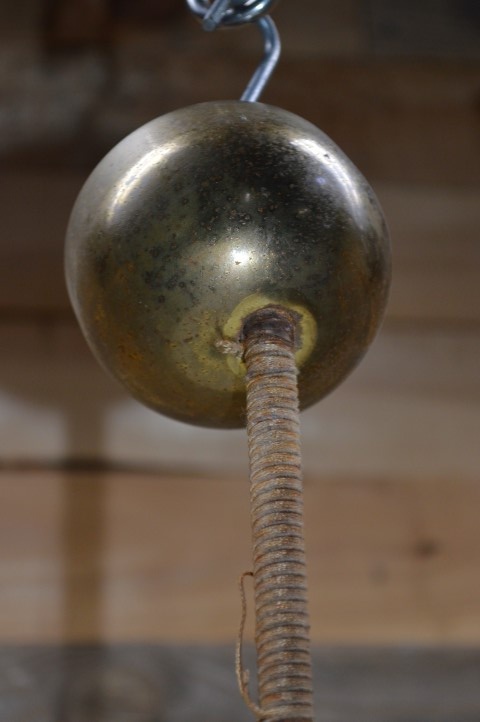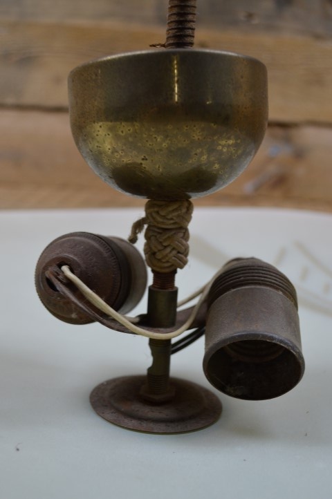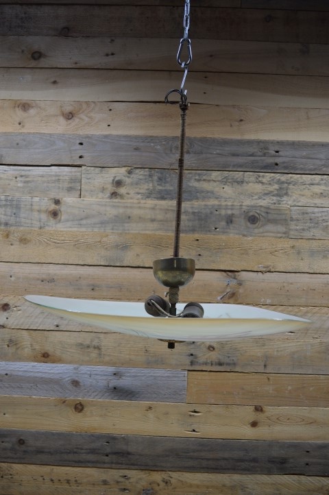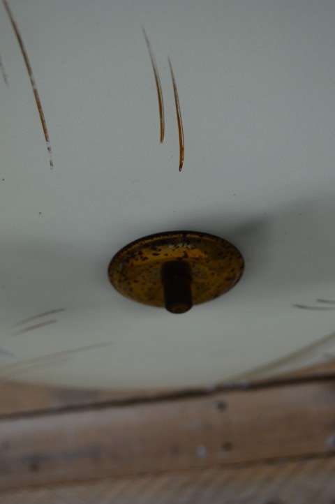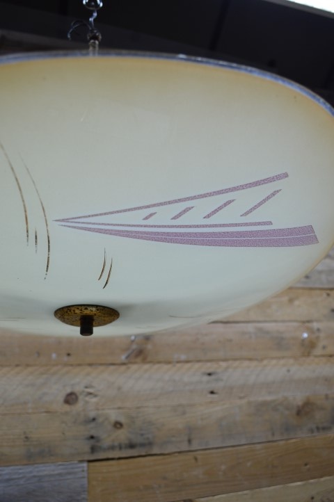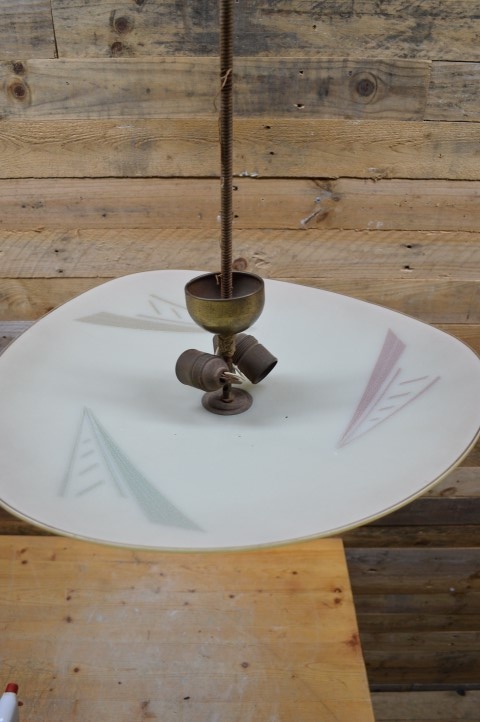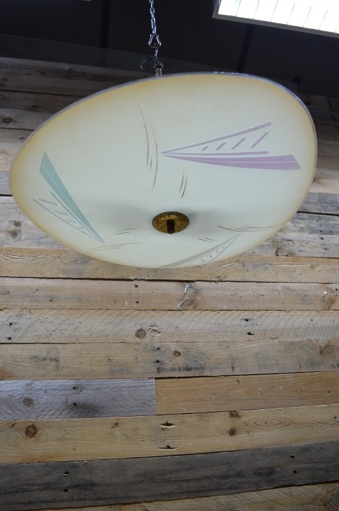 Vintage space-age hanglamp of plafondlamp met sierlijke gekleurde werkjes op het glas en met de originele fittingen en hangbuis uit de jaren 1960 en geproduceerd door Inva Litoměřice in Tsjechoslowakije. Door de jaren heen heeft de lamp wel wel wat gebruikssporen opgelopen zo zijn er aan de rand een paar kleine schilfertjes af, heeft het metaal wat roestpuntjes en is de bedrading toe aan vervanging. Maar al met al is het een mooie lamp die door een liefhebber zeker gewaardeerd word.