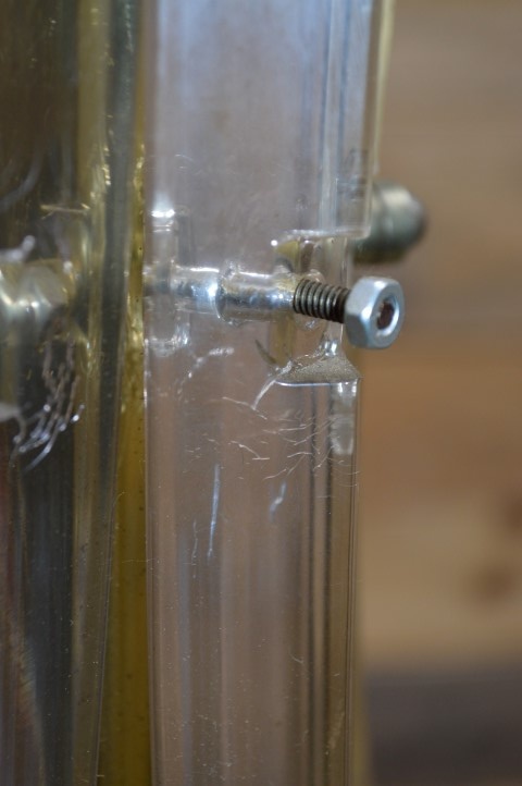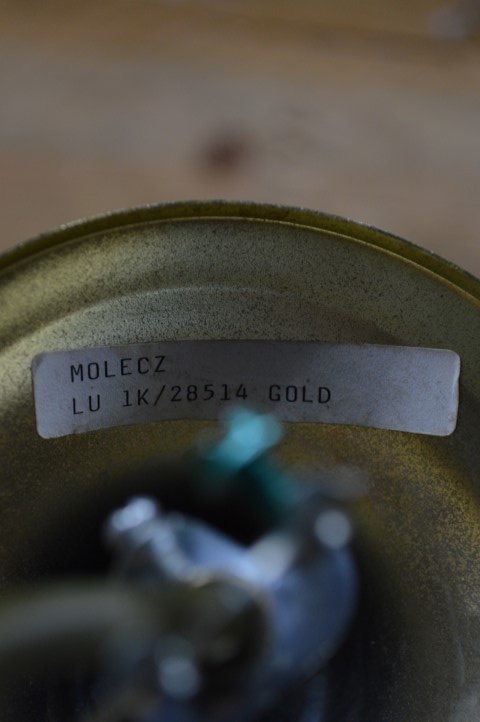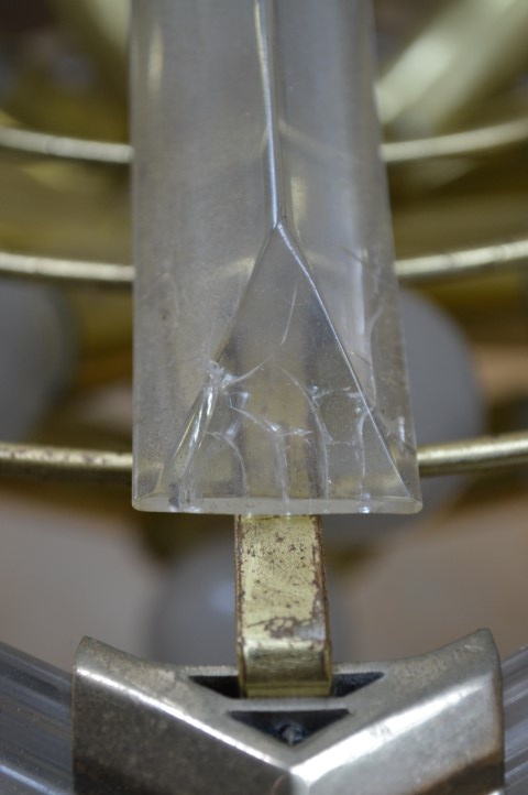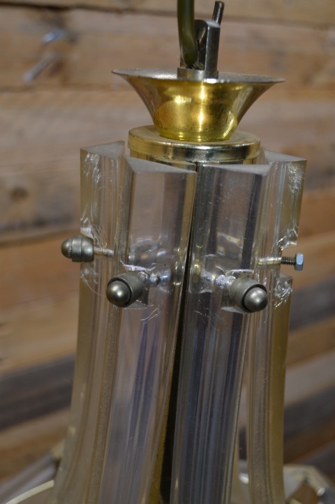 De tweedehands lamp heeft gebruikssporen, craquelé barstjes in het plastic en 1 metalen dopje mist er.