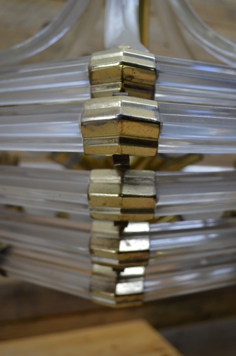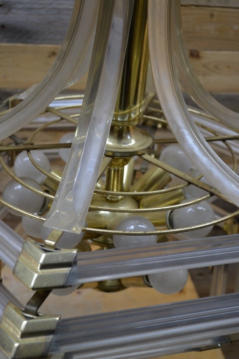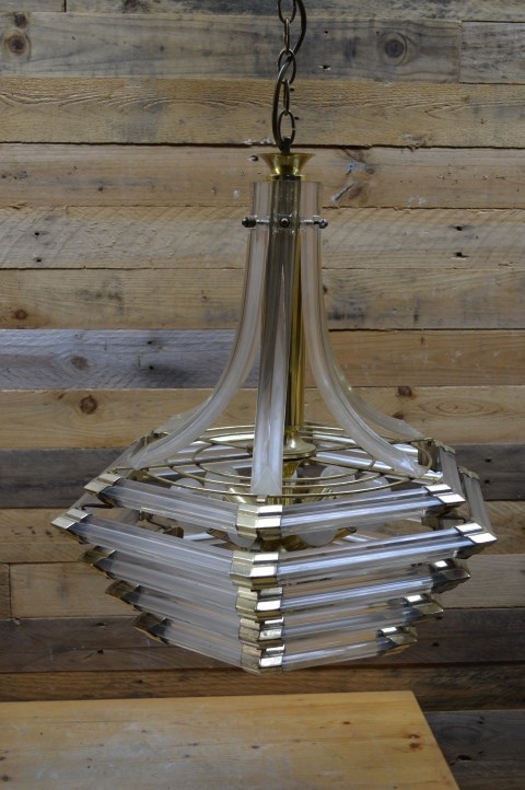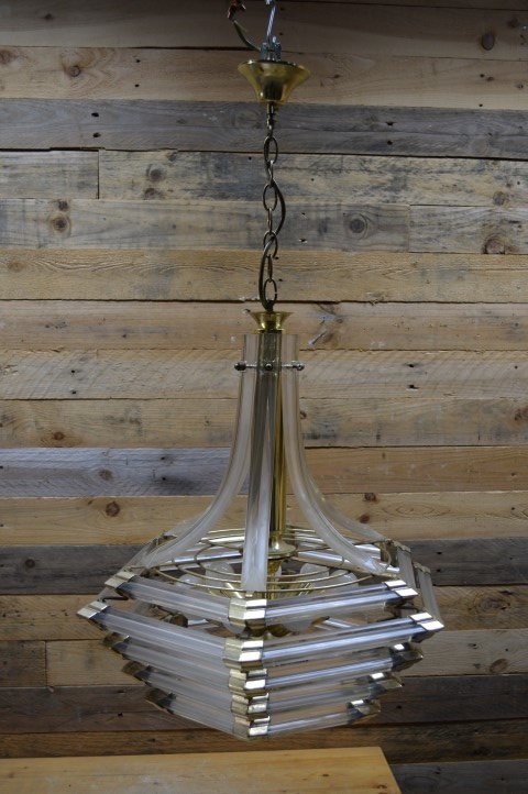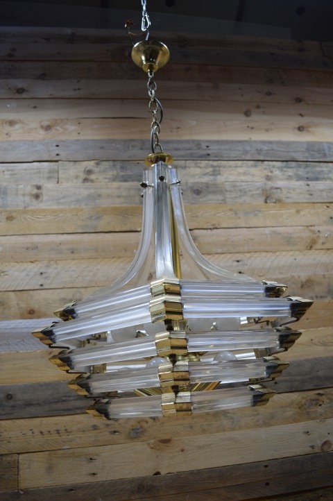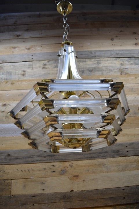 Mooie vintage design kroonluchter. Deze jaren 70 hanglamp is een zeshoekig ontwerp met zware kunststof staven in een zetting van geelkoperkleurig metaal. Een schitterende lamp voor boven een mooie tafel of aan het plafond in een hal of trapgat.
