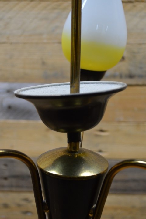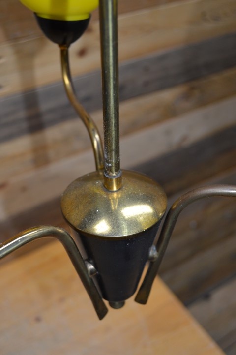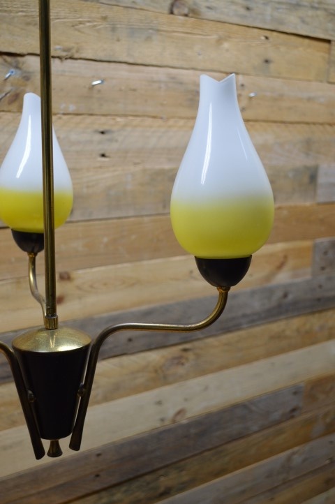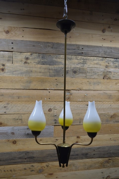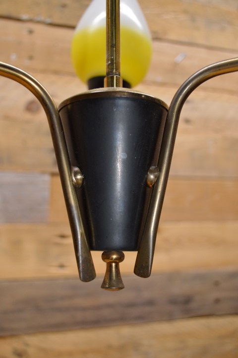 Fantastische retro hanglamp met drie lampenglazen in de vorm van een tulp. De mid century metalen luchter hangt aan een koperen buis vanaf het plafond naar beneden. Het design van deze kroonluchter dateert van ongeveer 1950.