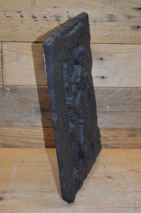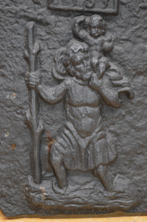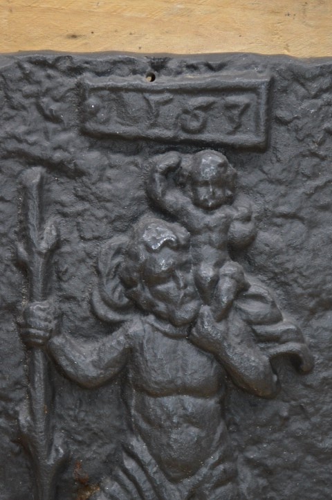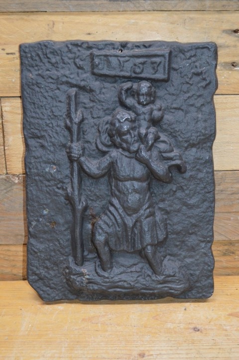 Oude gietijzeren haardplaat met de Heilige Christoffel 1563. Op de prachtige kachelplaat is de heilige Christoffel afgebeeld die het kindje Jezus op zijn schouders over de rivier draagt. Hij gebruikt zijn lange stok om door het water te wandelen.