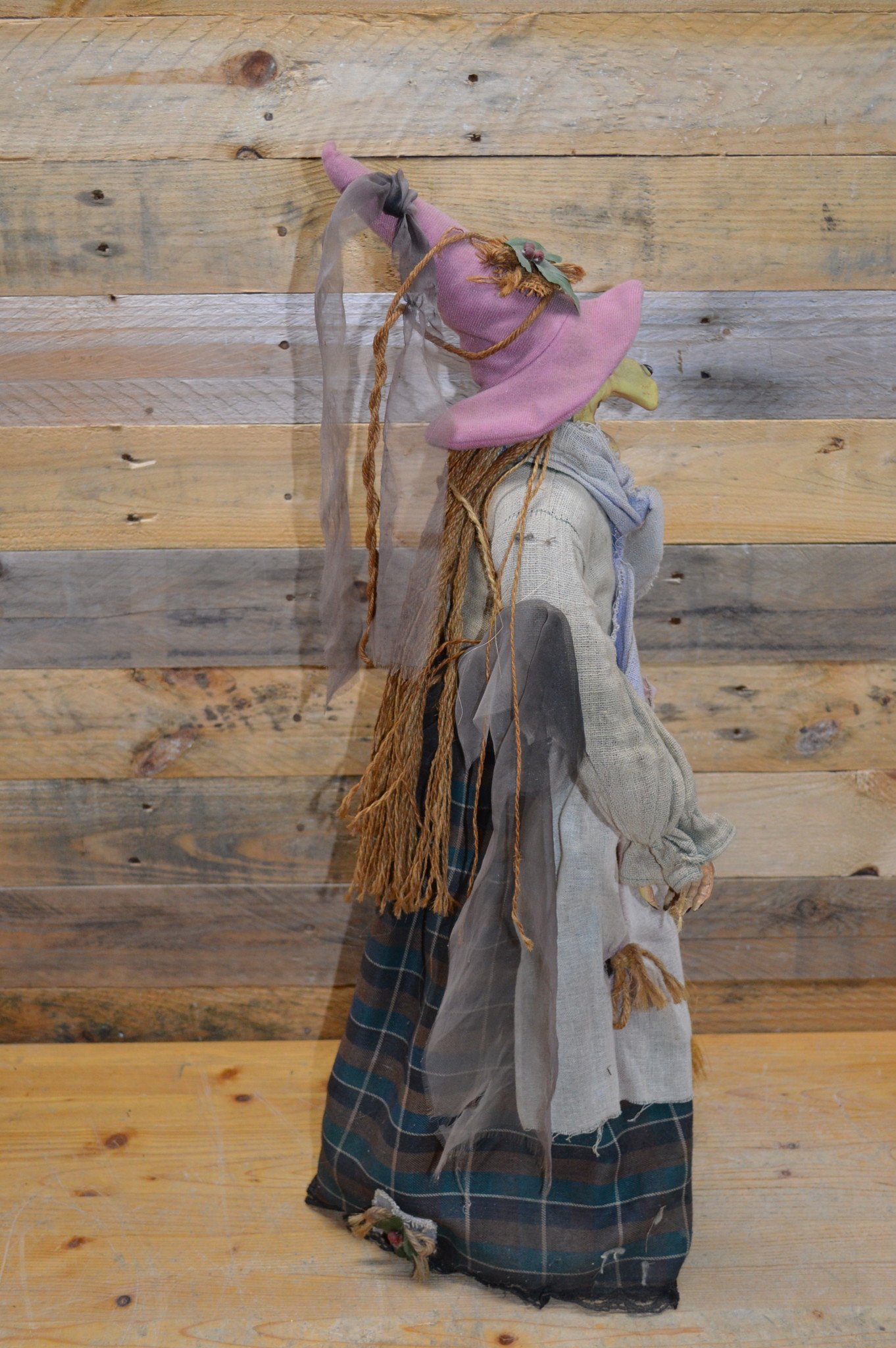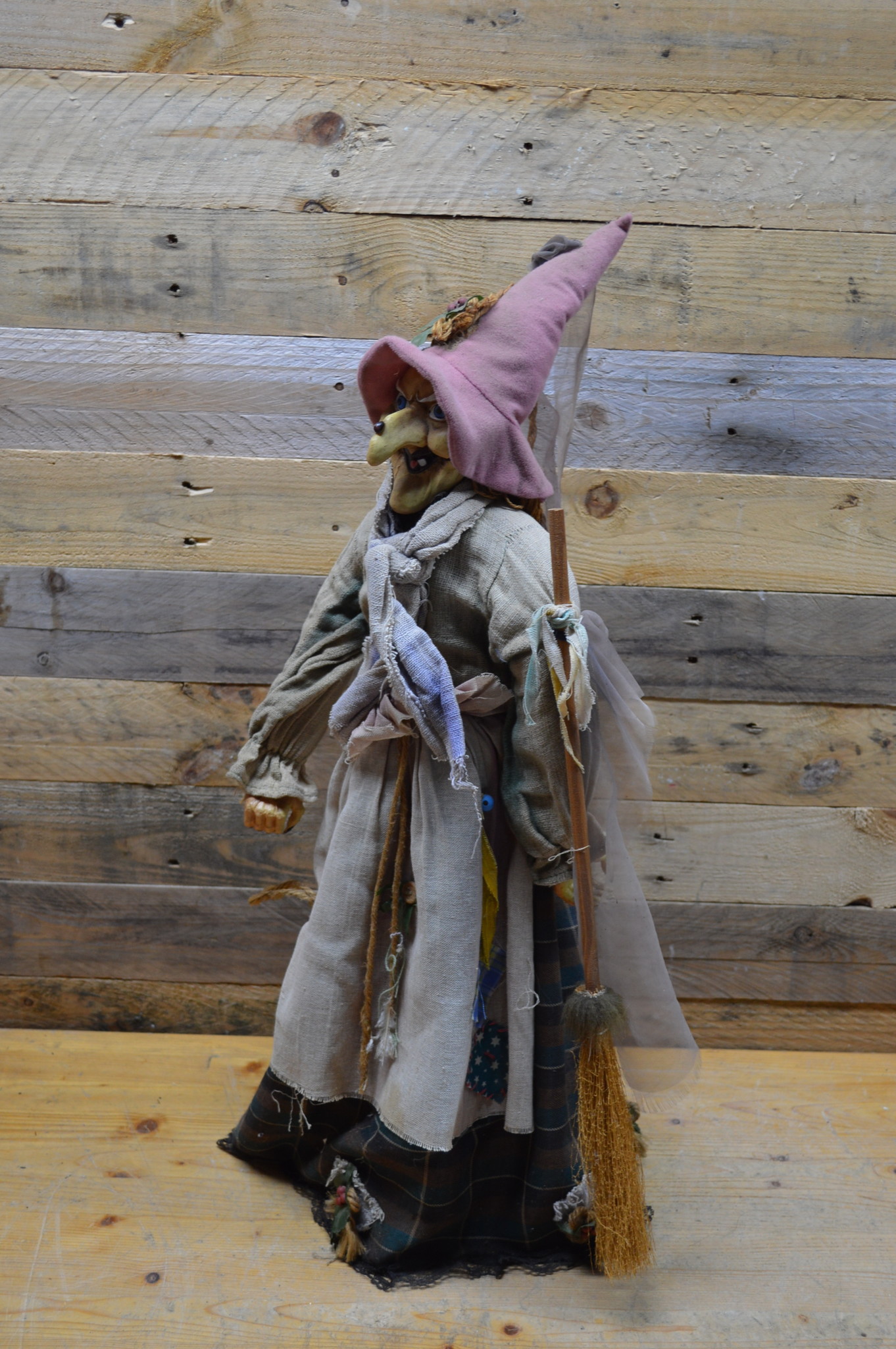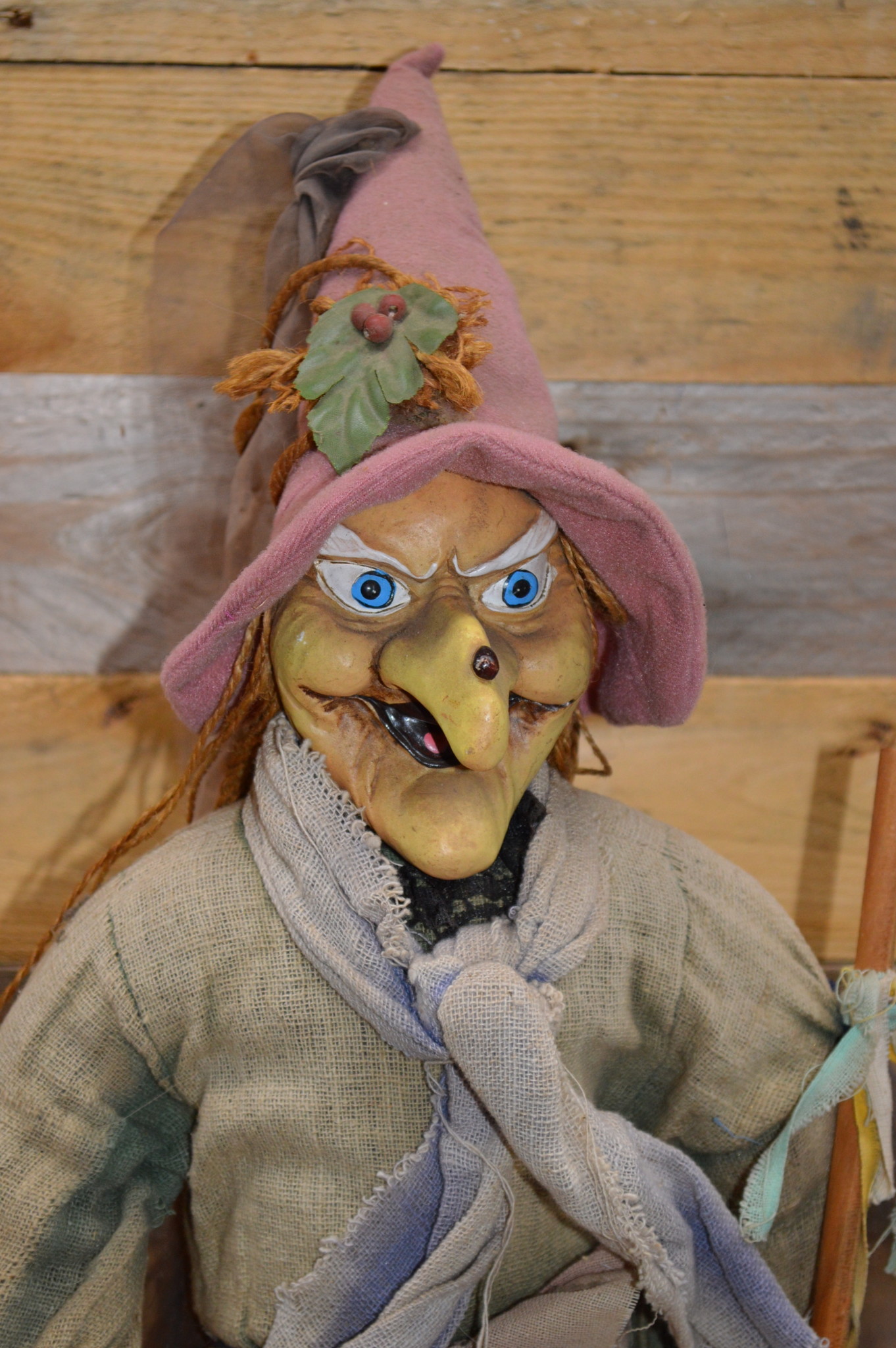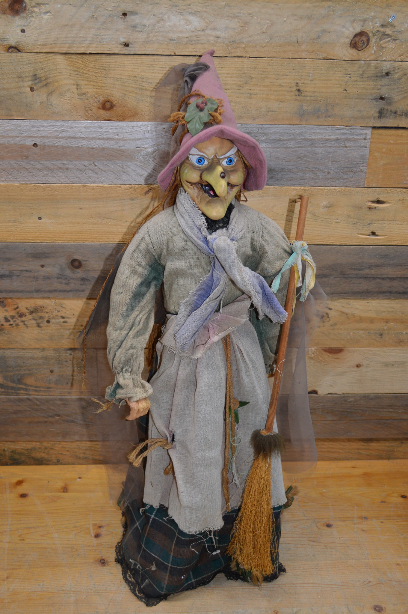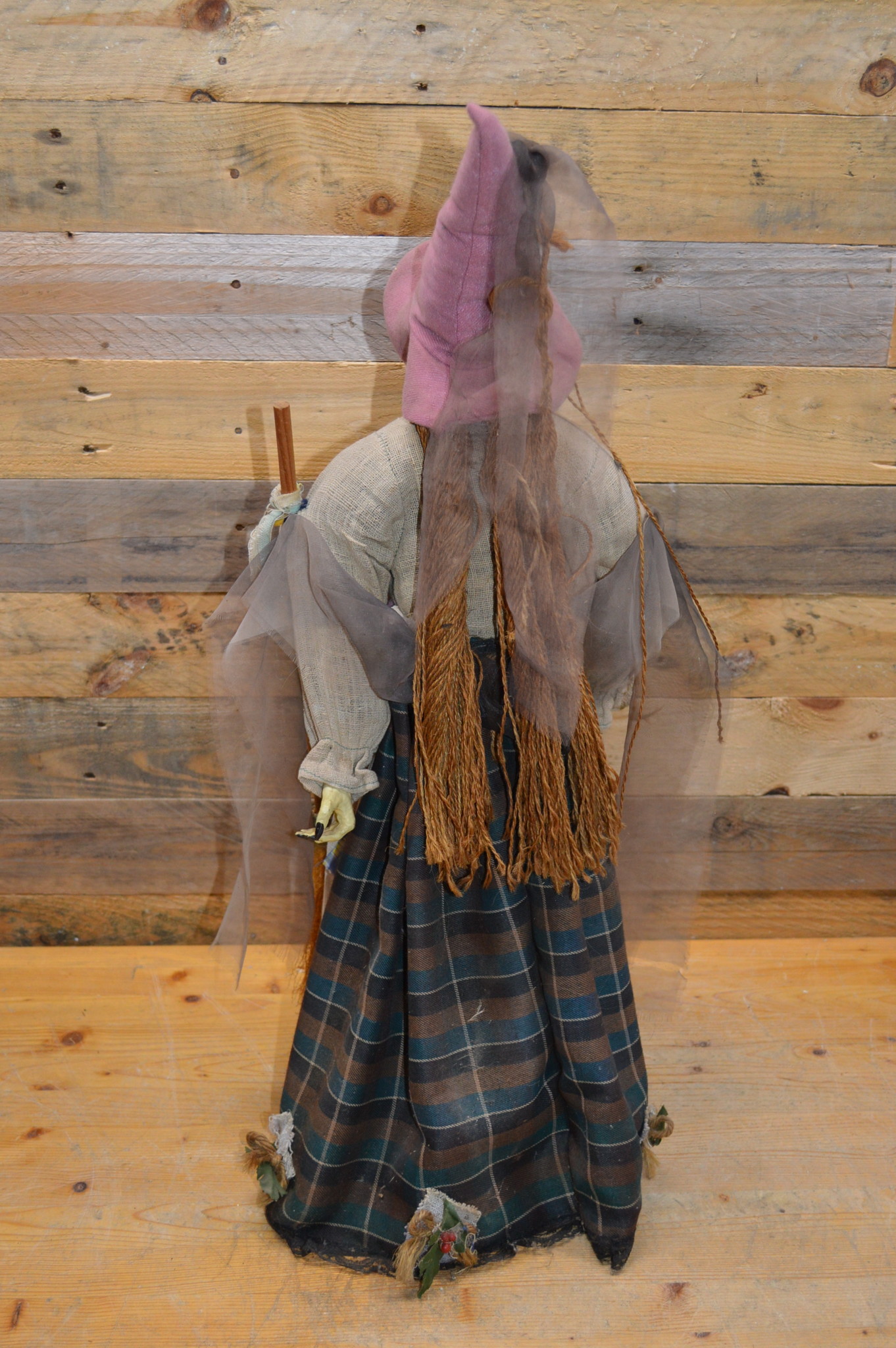 Grote heksenpop met oude kleding en bezem. Deze heks is voorzien van een grote heksenhoed en jurk en is erg leuk als ouderwetse decoratie, bijvoorbeeld naast een kast of als ludiek cadeau aan uw schoonmoeder, maar kan ook goed op de grond bij een deur staan.