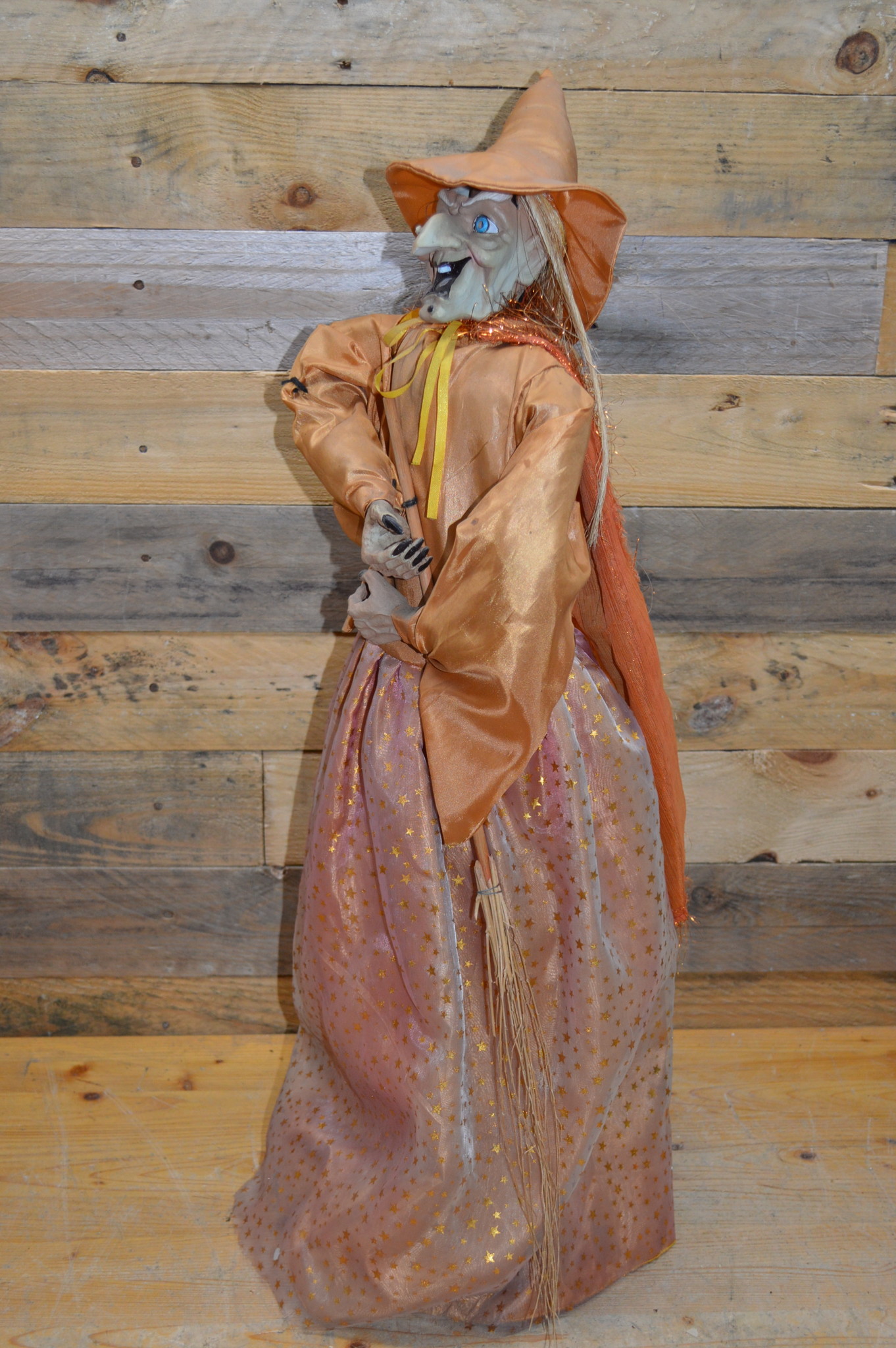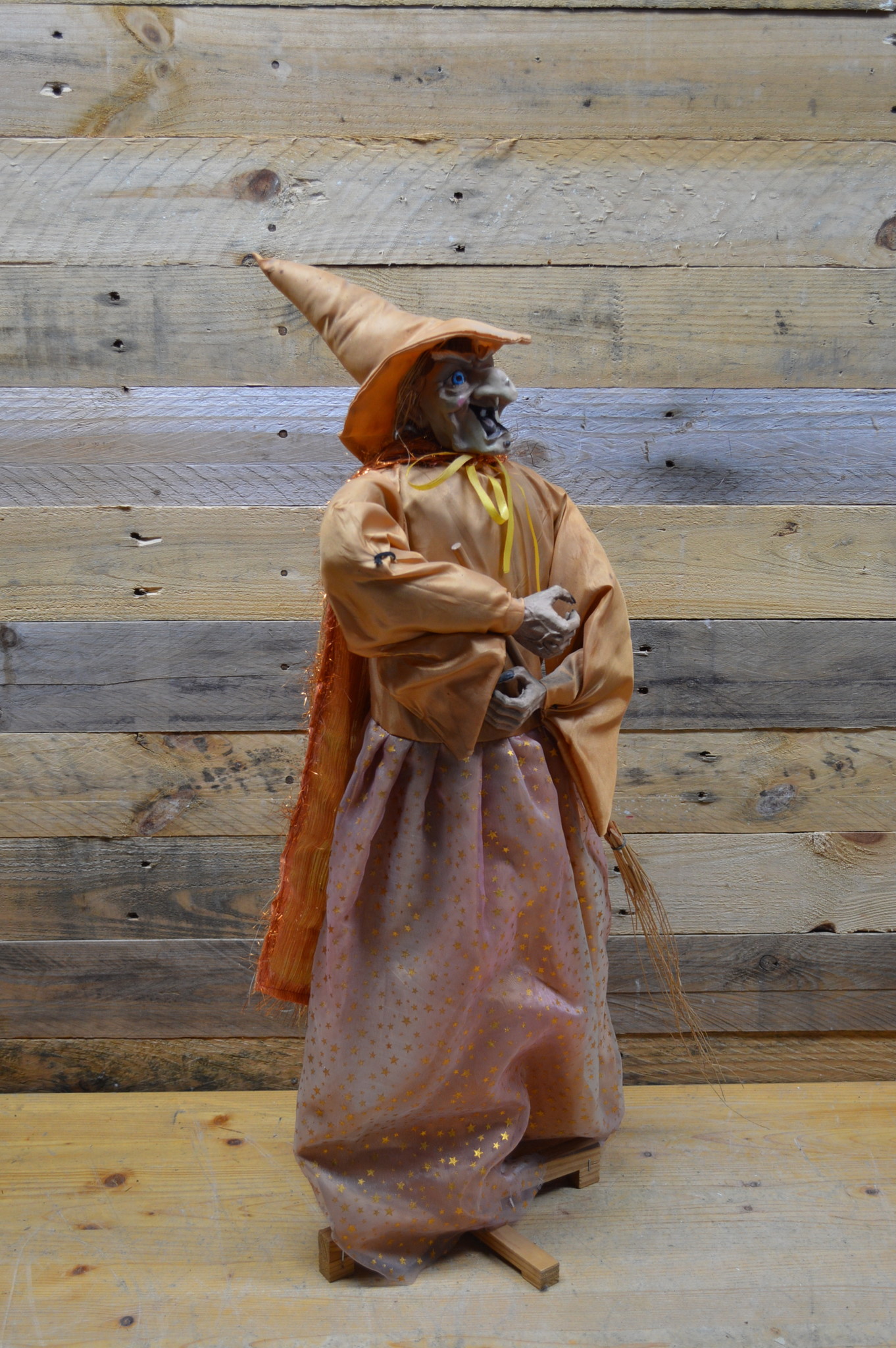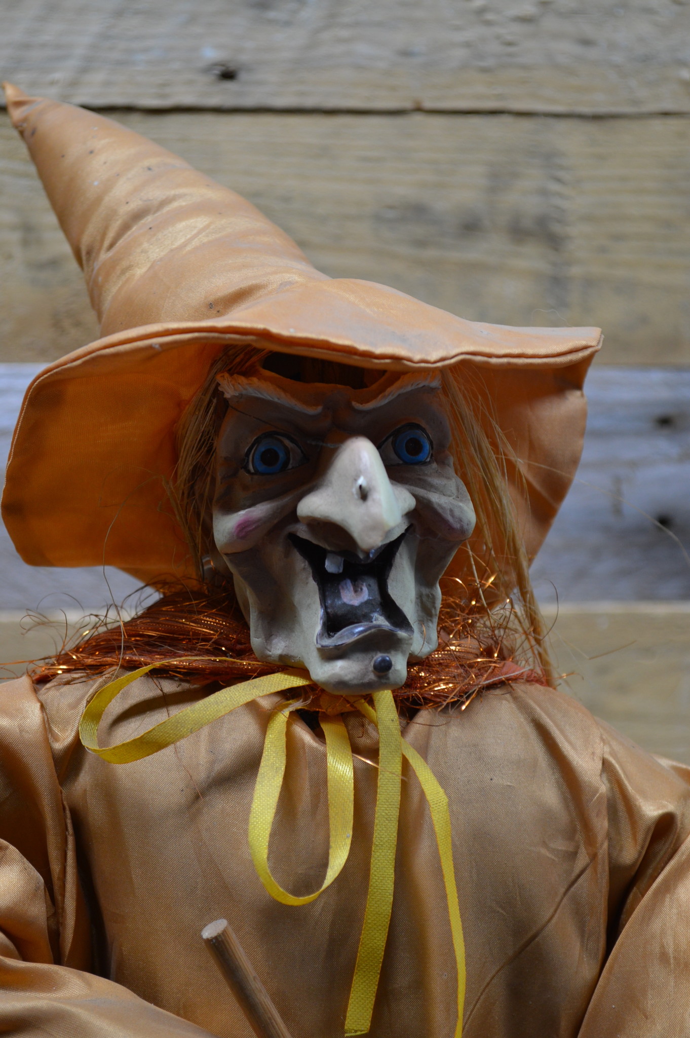 Grote heksenpop met bezem Deze heks is voorzien van een grote heksenhoed en jurk en is erg leuk als ouderwetse decoratie, bijvoorbeeld naast een kast of als ludiek cadeau aan uw schoonmoeder, maar kan ook goed op de grond bij een deur staan.
