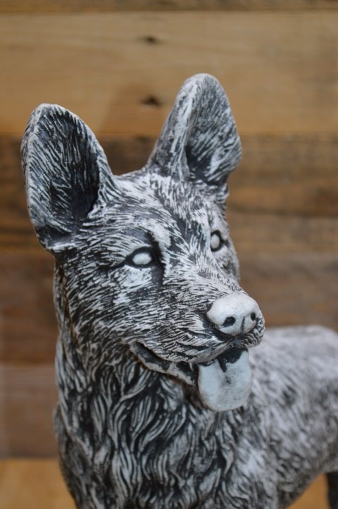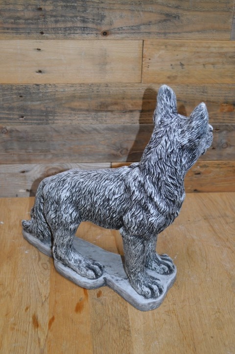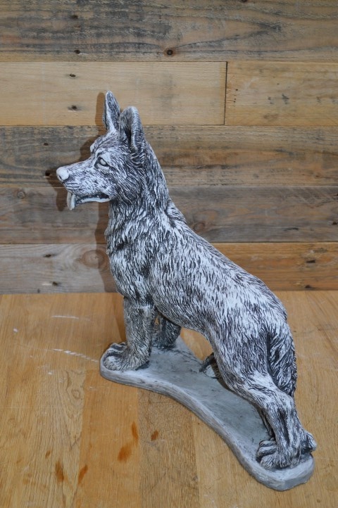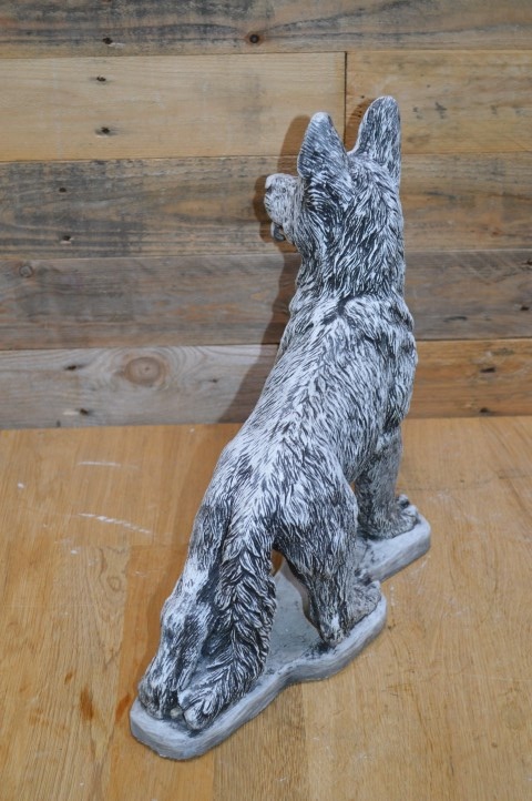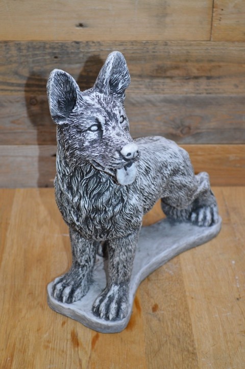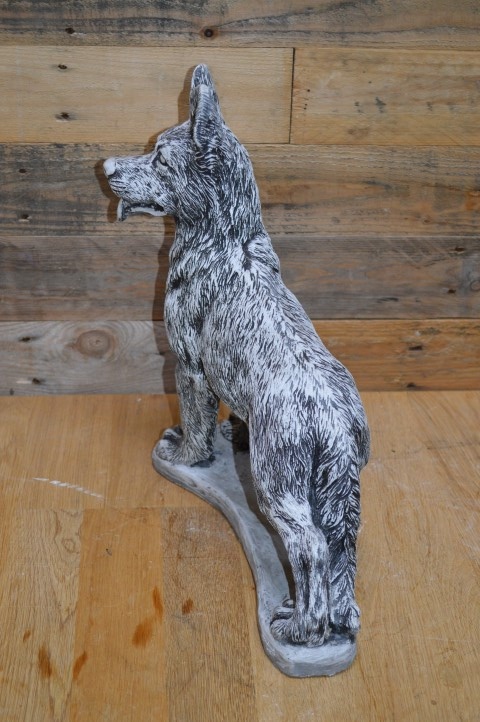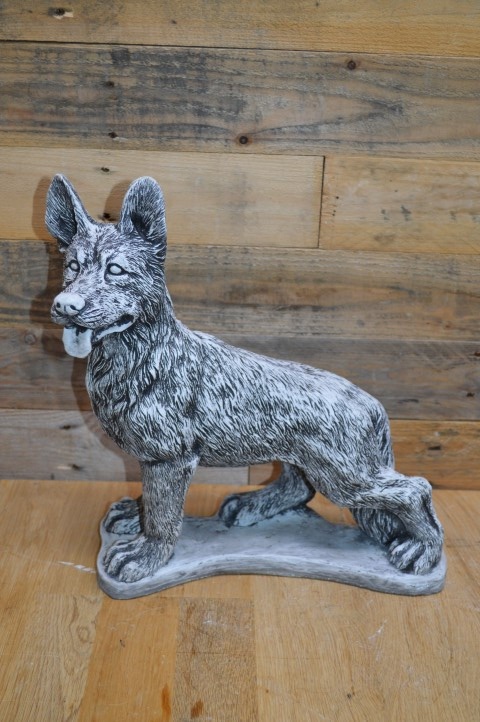 Betonnen beeld staande herdershond – Deze prachtige herdershond staat paraat, met zijn oren recht omhoog gespitst. Het levensechte ontwerp geeft het gevoel dat de hond zo naar je toe zal komen om te spelen.Het beeld is gegoten uit hoogwaardig gietsteen en is daardoor perfect geschikt voor zowel buiten als binnen. Door zijn alertheid en natuurlijke houding is deze hond niet alleen decoratief, maar straalt hij ook waakzaamheid en energie uit.Een prachtig beeld voor hondenliefhebbers, en ook ideaal als eerbetoon aan een trouwe viervoeter.