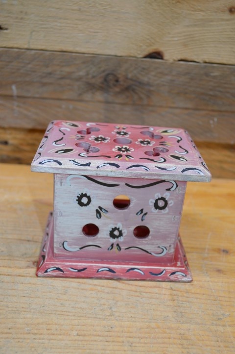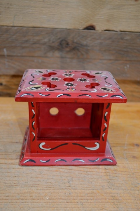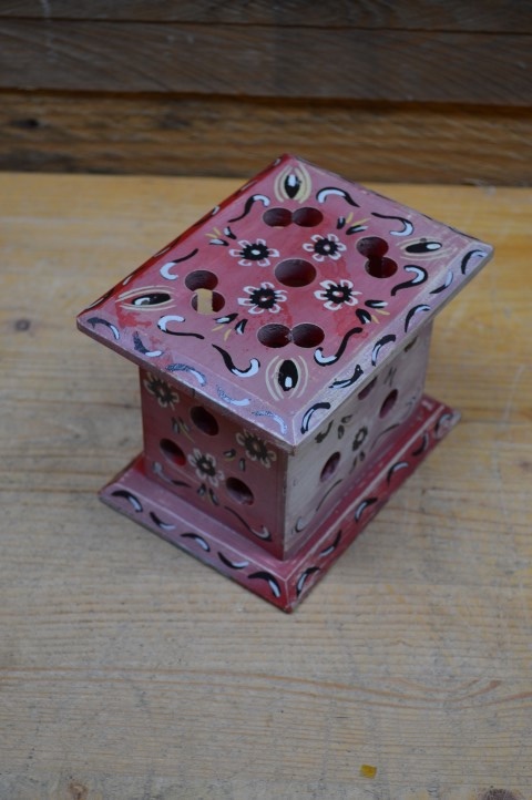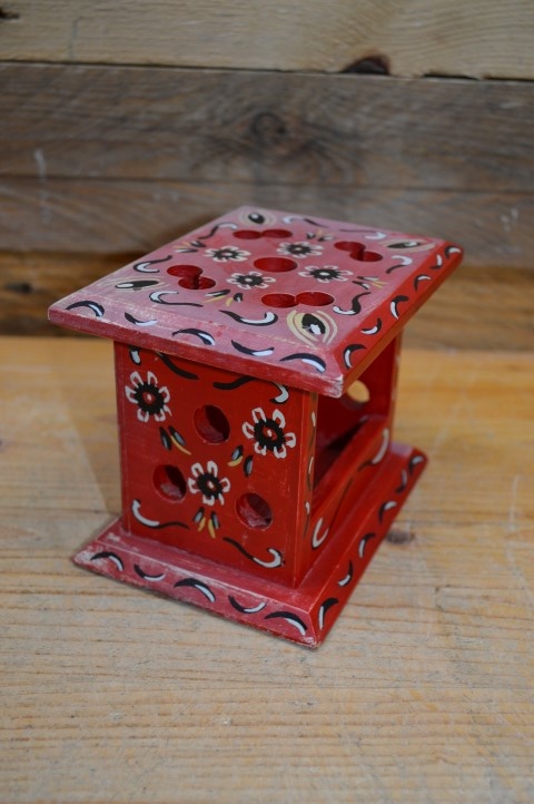 Prachtige kleine voetenstoof met Hindelopen motieven beschilderd. Vroeger werden deze stoven vaak gebruikt om de voeten warm te houden, wat gebeurde door een bakje met hete kolen in de stoof te plaatsen, maar tegenwoordig zijn ze ook erg leuk om ergens neer te zetten als decoratie.