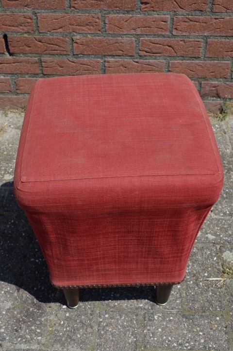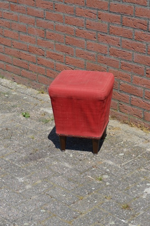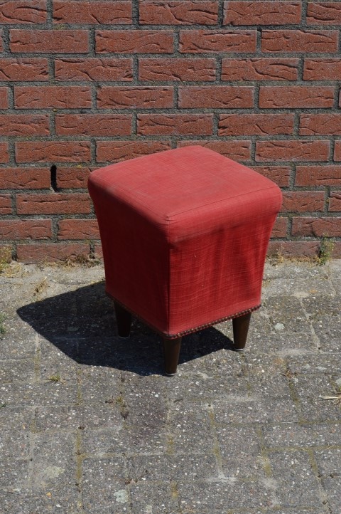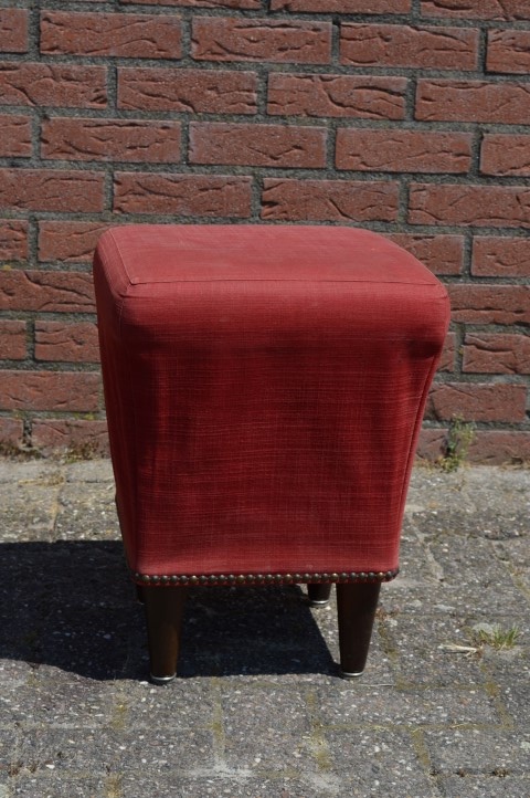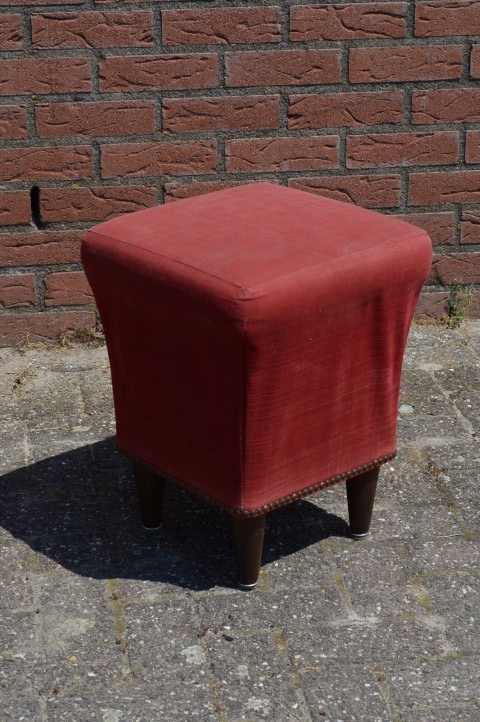 Deze hocker zitkrukje jaren 50 is een charmant vintage item met een klassieke uitstraling. Bekleed met rode stof en geplaatst op vier sierlijke poten, waardoor hij elegant en iets hoger oogt. Oorspronkelijk gebruikt bij de kachel, maar nu perfect als krukje, poef of bijzetkrukje. De stof is wat vaal en er zijn gebruikssporen aanwezig, wat juist zorgt voor extra karakter en authenticiteit.