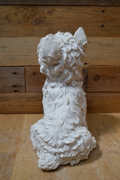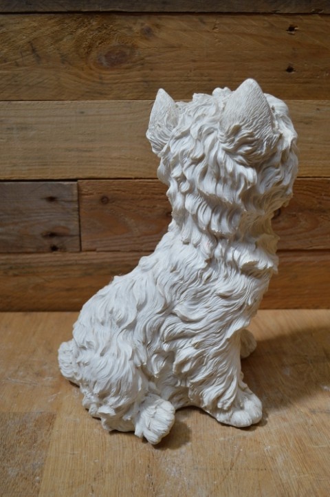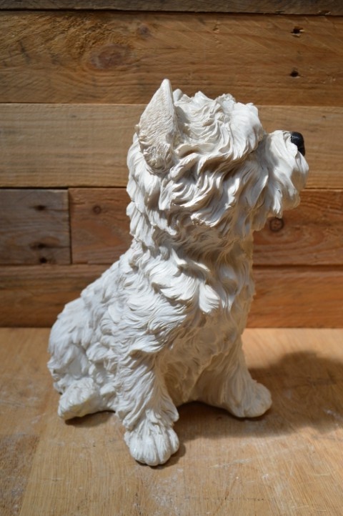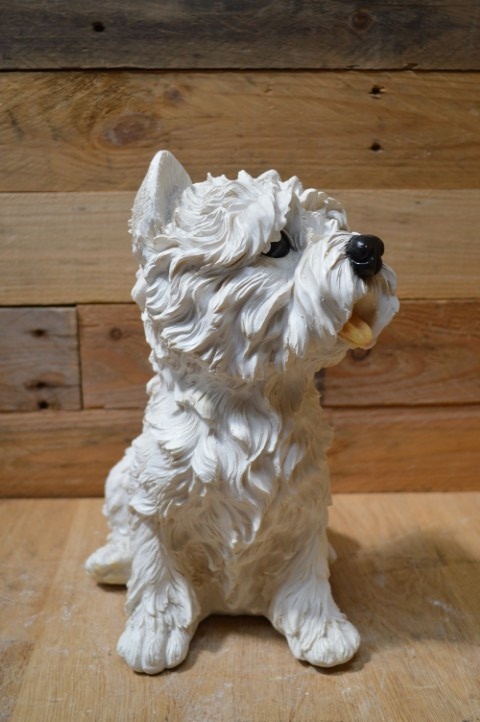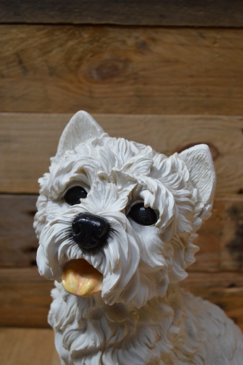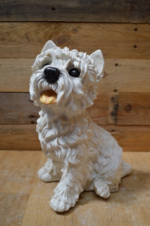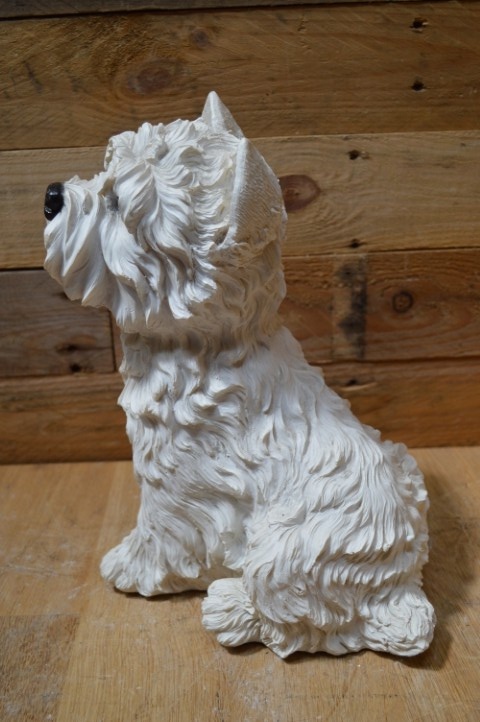 Dit tweedehands beeldje van een West Highland terriër is een charmant decoratief item voor in huis of tuin. Het is vervaardigd uit duurzaam polystone, een materiaal dat bekendstaat om zijn weerbestendigheid en fijne afwerking. Dankzij de schattige en herkenbare vorm van de terriër is dit beeldje een geliefd verzamelobject voor hondenliefhebbers.