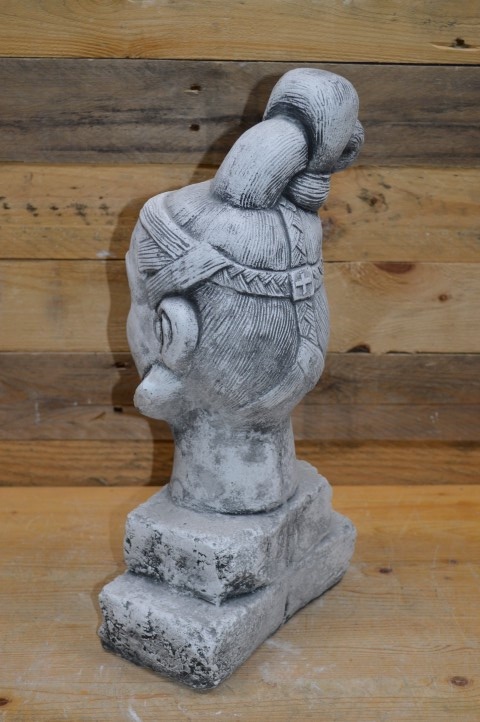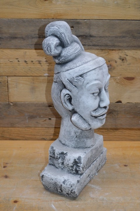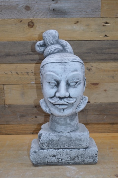 Hoofd van een krijger van het Chinese Terracotta leger is een betonnen beeld dat uitstekend past in speciale tuinen maar het kan natuurlijk ook gewoon op de vijverrand staan of binnen in de boekenkast. Een zeer mooi decoratief (tuin)beeld van beton.