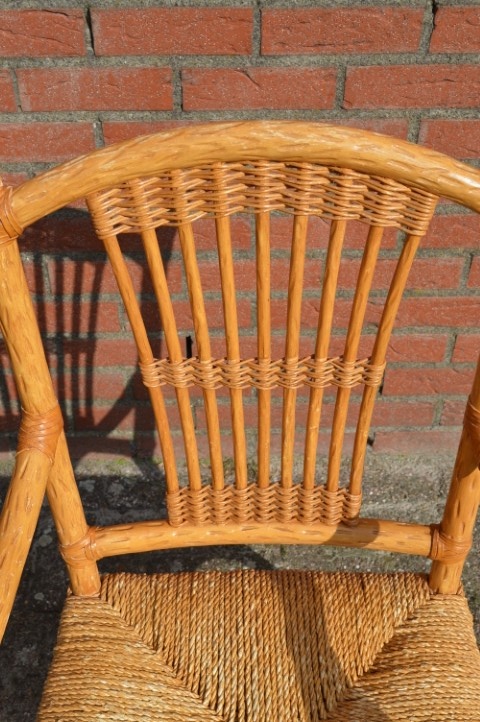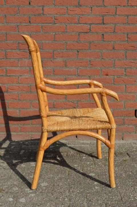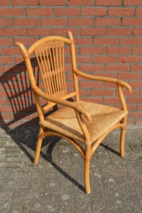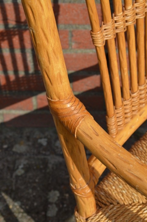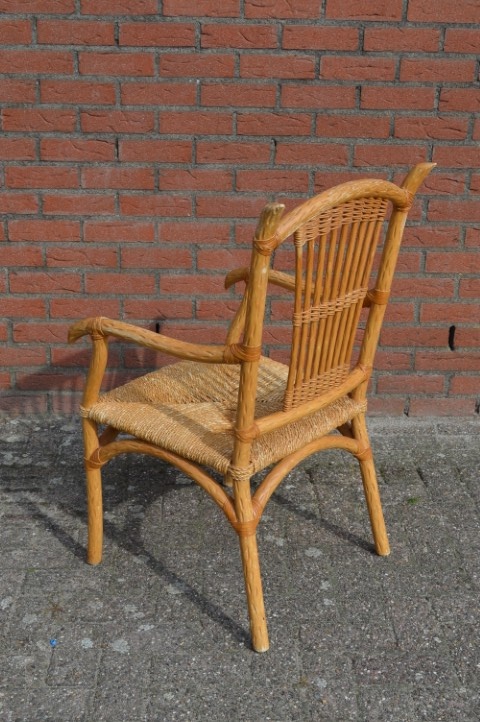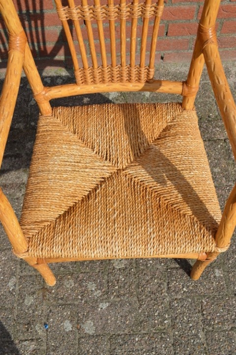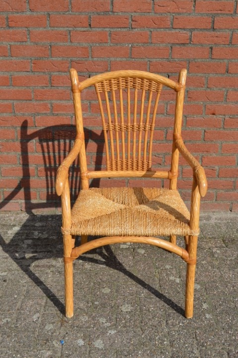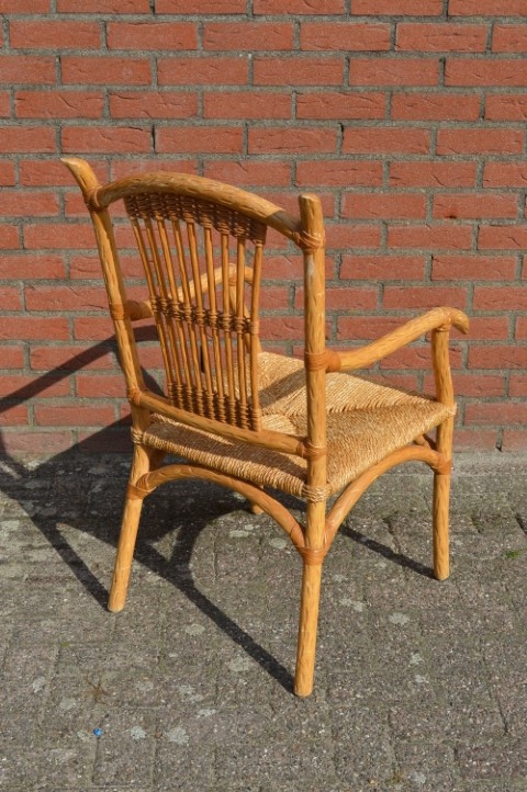 Deze prachtig gevormde fauteuil heeft een rugleuning met ronde houten spijlen die in een korenschoofpatroon zijn samengevlochten met rotan. De zitting is gemaakt van stevig gevlochten touw, wat zorgt voor een authentieke, rustieke uitstraling. Alle verbindingen zijn versterkt met rotan banden, wat de kwaliteit en duurzaamheid van de stoel onderstreept.