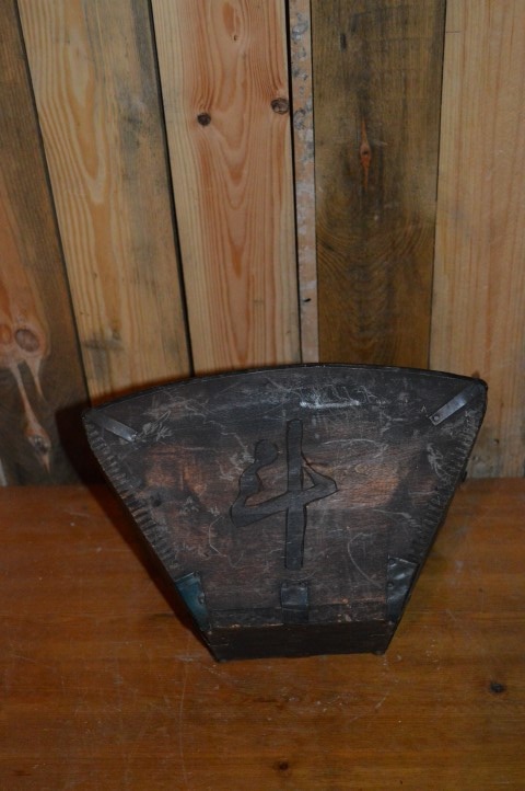 Dit simpele bakje heeft een handvat dat verzonken is zodat de bakjes gestapeld konden worden. Op de hoeken zitten kleine ijzeren stootrandjes gemonteerd ter versteviging.
