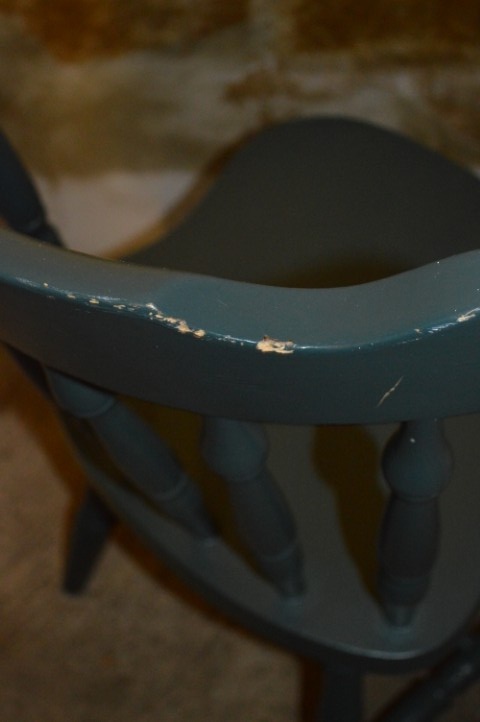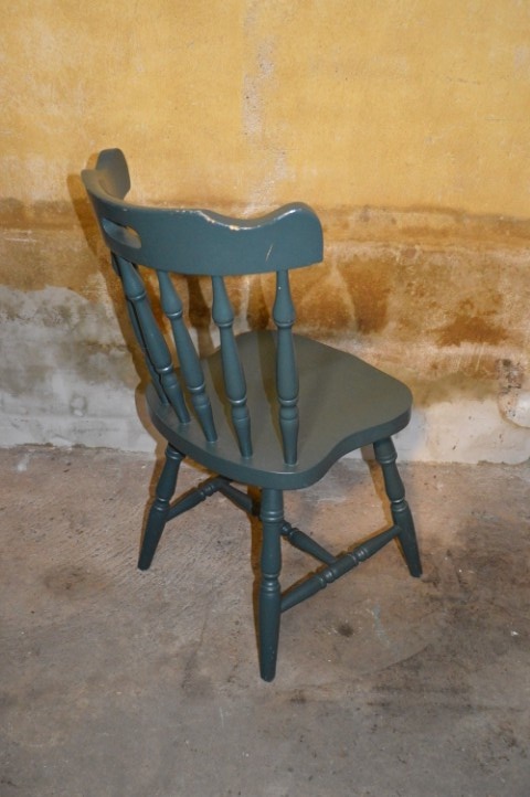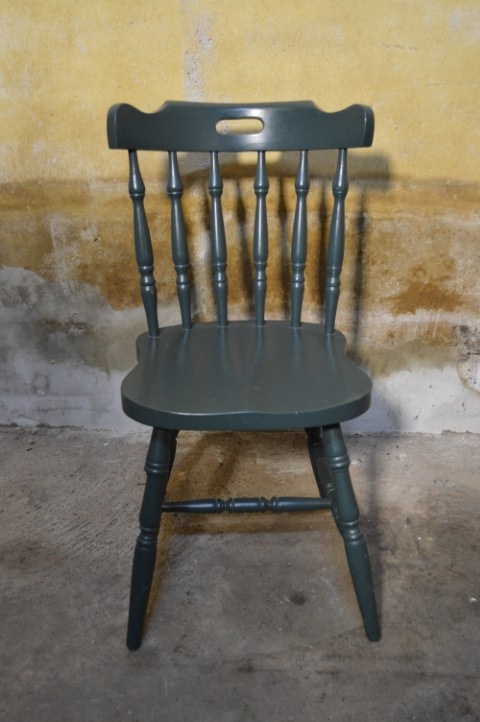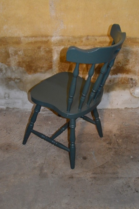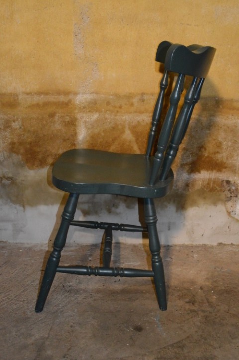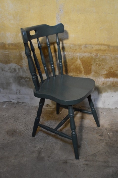 Deze ouderwetse houten keukenstoel is uitgevoerd in een donkergrijze verflaag en heeft een klassieke uitstraling.