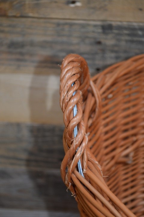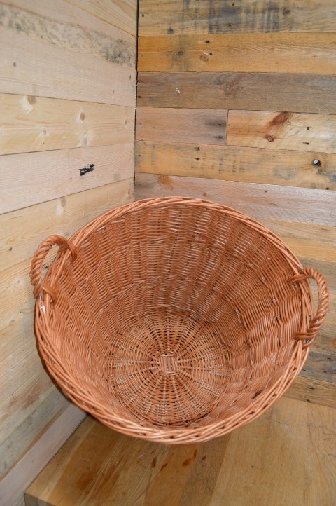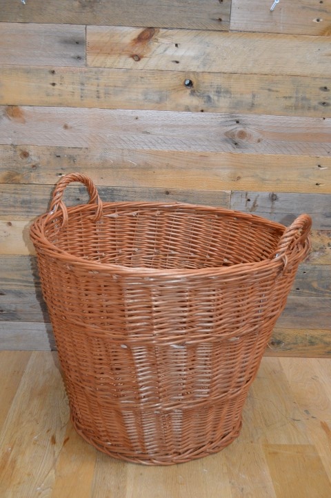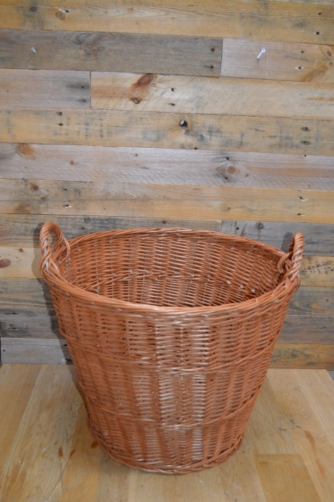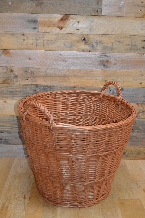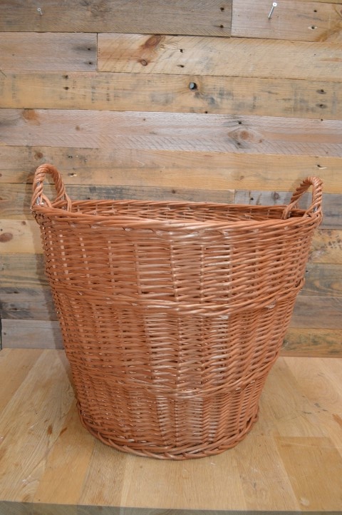 Een grote mand met twee verstevigde handvatten gevlochten van gebleekte wilgentenen in de vorm van een houtmand of aardappelmand zoals die in vroeger dagen gebruikt werd. Ook nu nog prima te gebruiken als houtmand of als krantenmand.