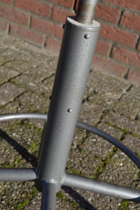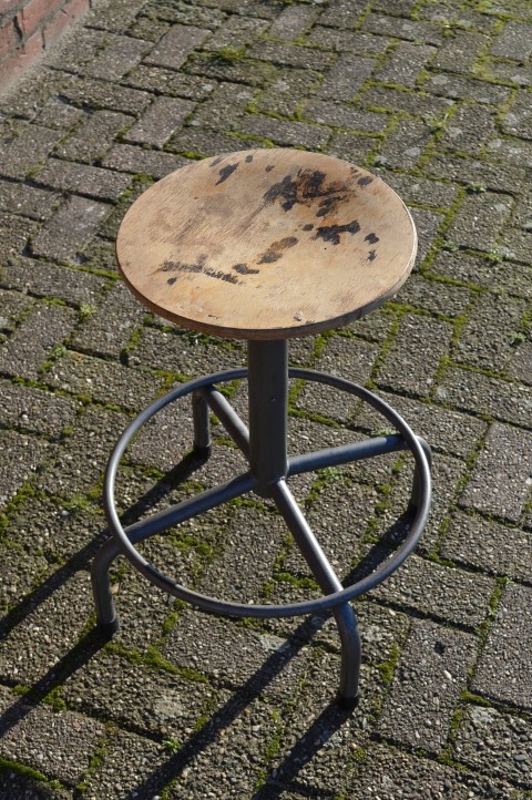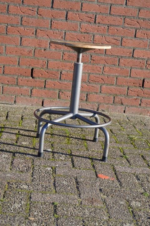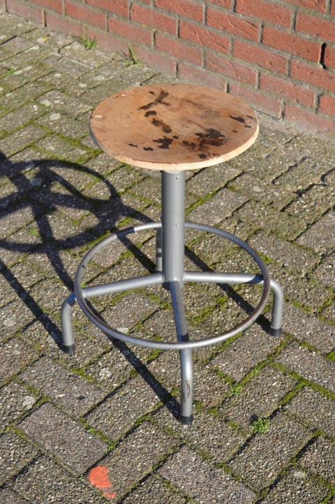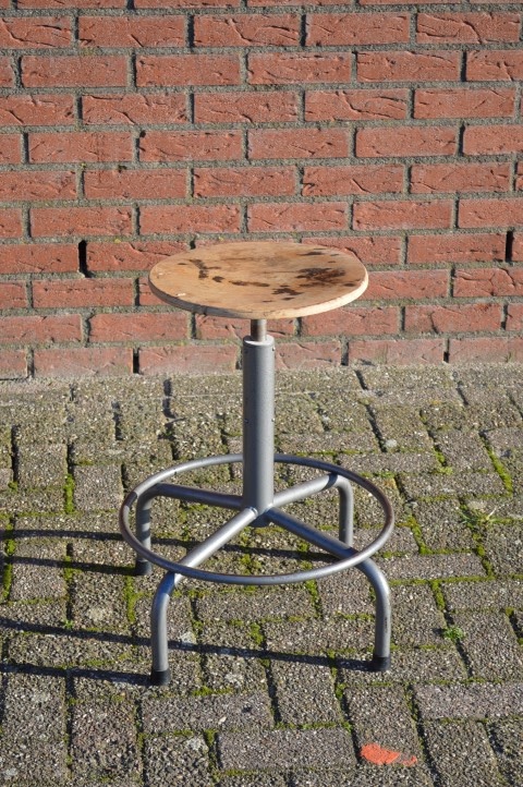 Dit ronde zitkrukje heeft in de loop der jaren wel enige gebruikssporen opgelopen, maar is ondanks dat een echte blikvanger in huis en zeker een kijkje waard voor liefhebbers van oude industriële meubels.