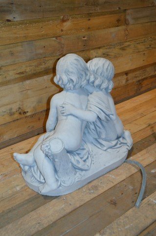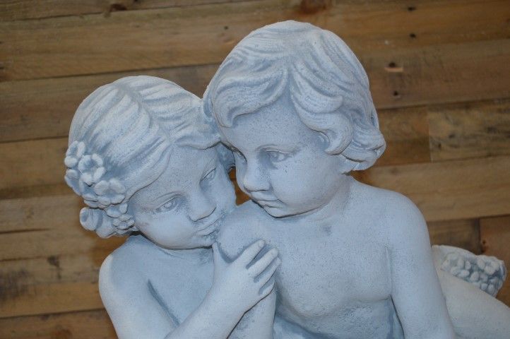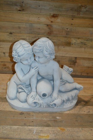 Het betonnen beeld kinderen met waterkruik is een idyllisch waterornament waarbij een jongetje en meisje samen spelen. De kruik vormt een klein watervalletje dat extra sfeer geeft aan elke vijver of waterpartij. Dit betonnen ornament wordt zonder pomp geleverd en is daardoor naar wens zelf in te richten. Een sfeervolle blikvanger voor tuin, terras of romantisch hoekje.