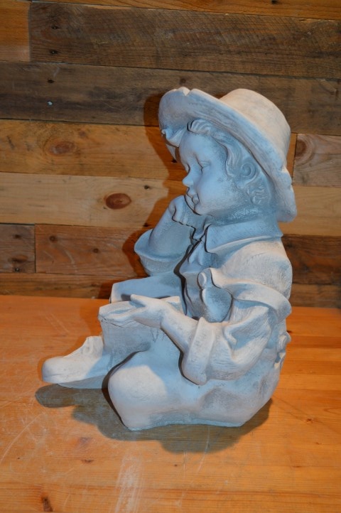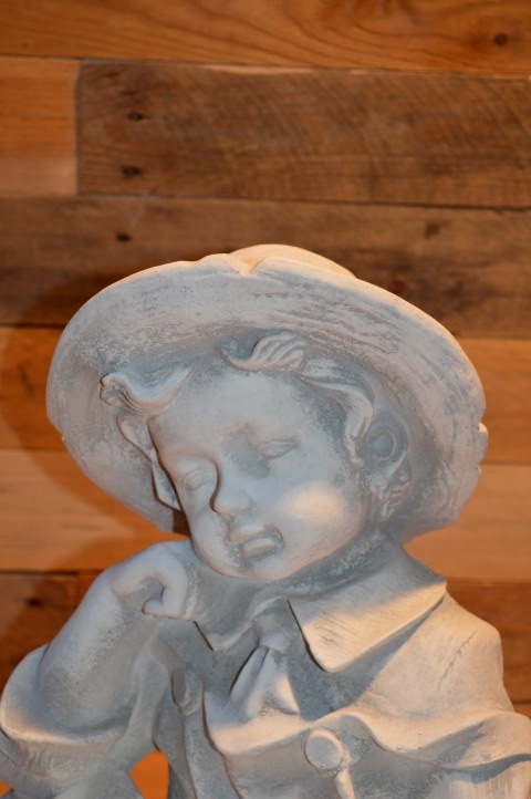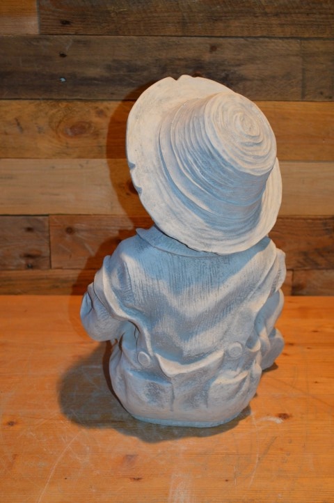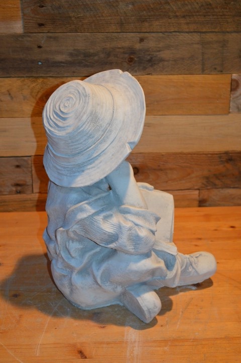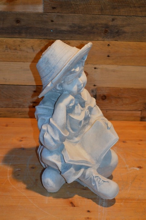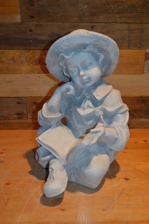 De lezende jongen van beton zit rustig in kleermakerszit verdiept in een boek, met een schattig hoedje op zijn hoofd. Dit beeld straalt rust en eenvoud uit, en is perfect voor een stil hoekje in de tuin, op een terras of zelfs binnen. Gemaakt van beton, ook wel gietsteen genoemd, is het bestand tegen weer en wind en blijft het jarenlang mooi. Een sfeervolle aanwinst voor liefhebbers van serene tuindecoratie.
