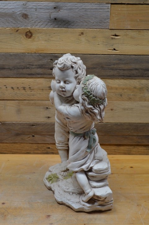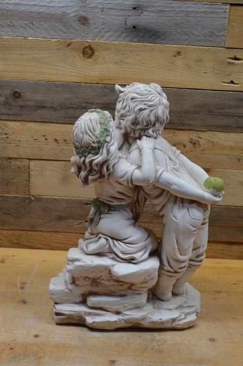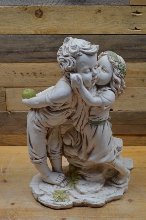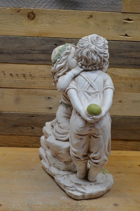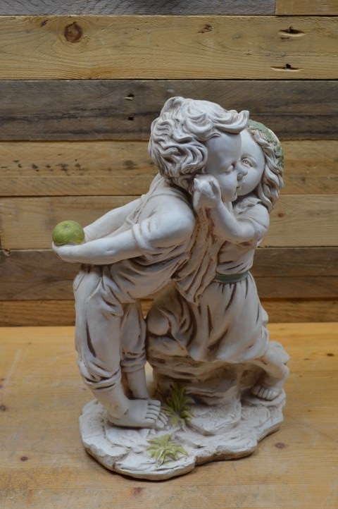 Dit prachtige betonnen beeld van een meisje en een jongen met appel is uitgevoerd in een warme terracotta kleur en is een echte blikvanger voor binnen of buiten. Het romantische tafereel van dit jonge verliefde paar maakt het beeld perfect als decoratief element in de tuin, maar ook binnenshuis, op een dressoir of bijzettafel, staat het prachtig. Of u het nu cadeau wilt geven of zelf houdt: dit charmante tuinbeeld fleurt iedere plek op.