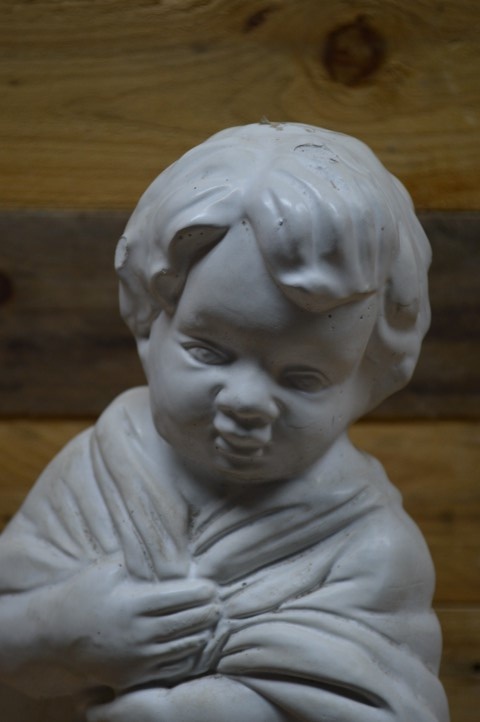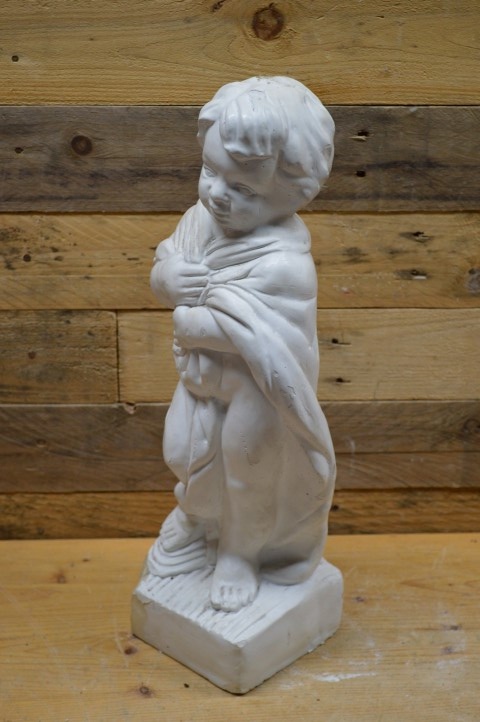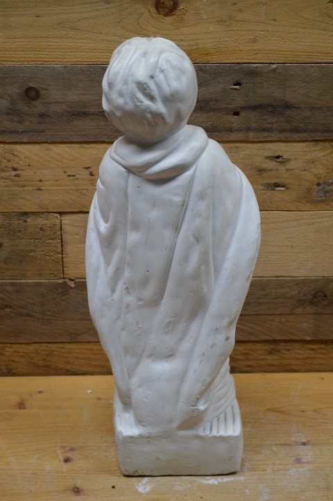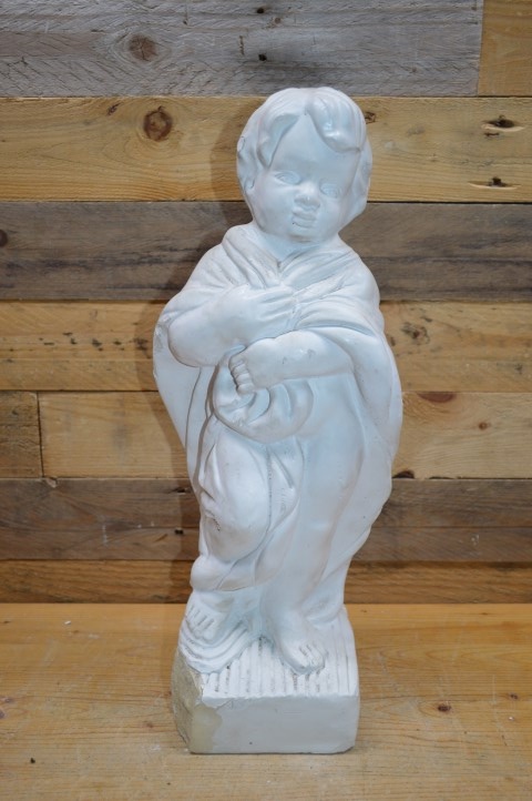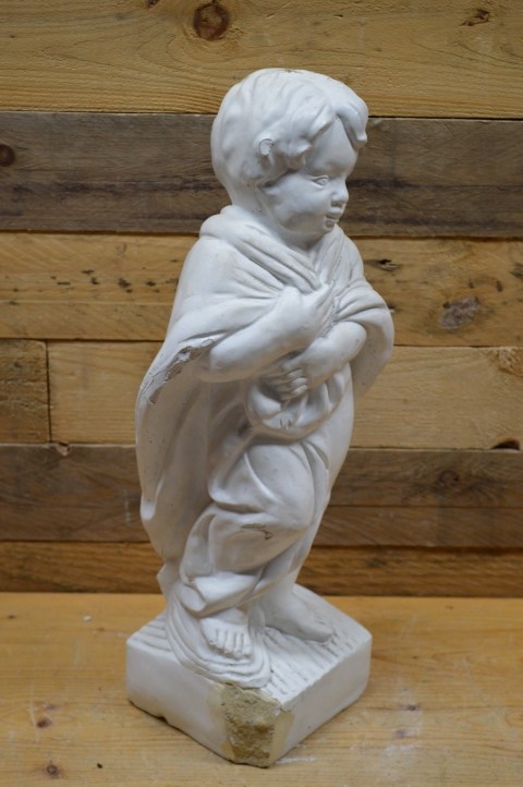 Tweedehands beeld van een kleine jongen met cape gemaakt van gips. Dit gipsen beeldje is ideaal als decoratie in huis. En dankzij het stevige voetstuk waarop dit kind staat valt het ook niet gemakkelijk om.