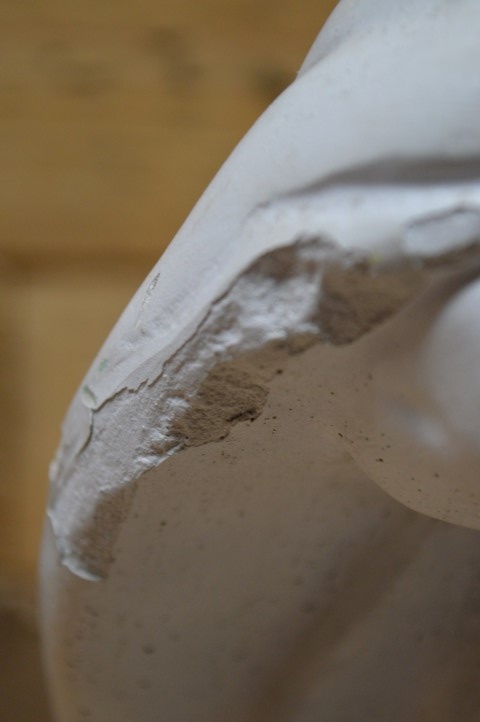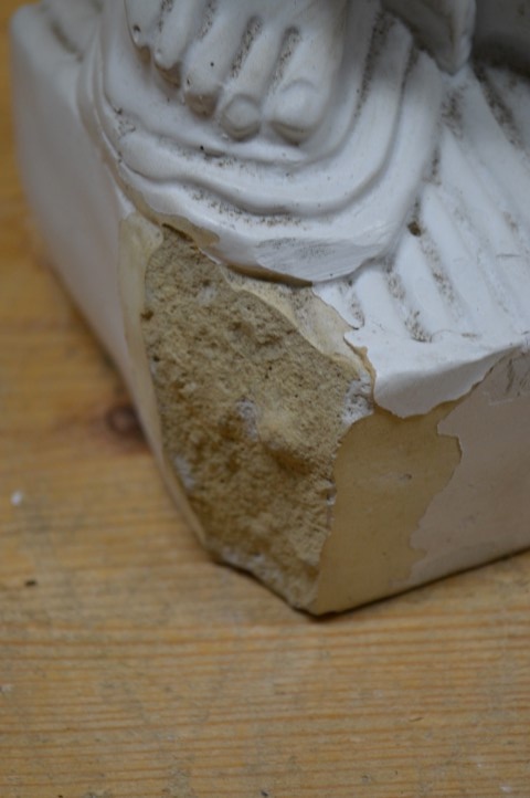 Het is een tweedehands beeld met gebruikssporen. Van de voet en de cape is een klein stukje afgebroken en dat zal bijgewerkt moeten worden.