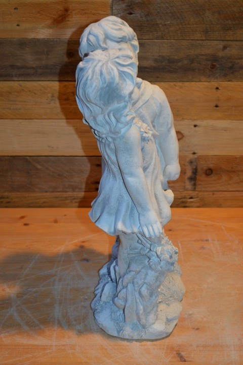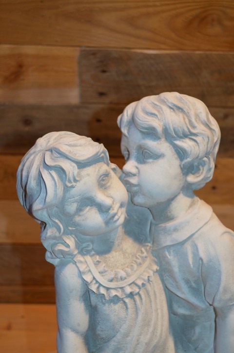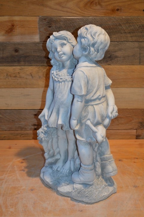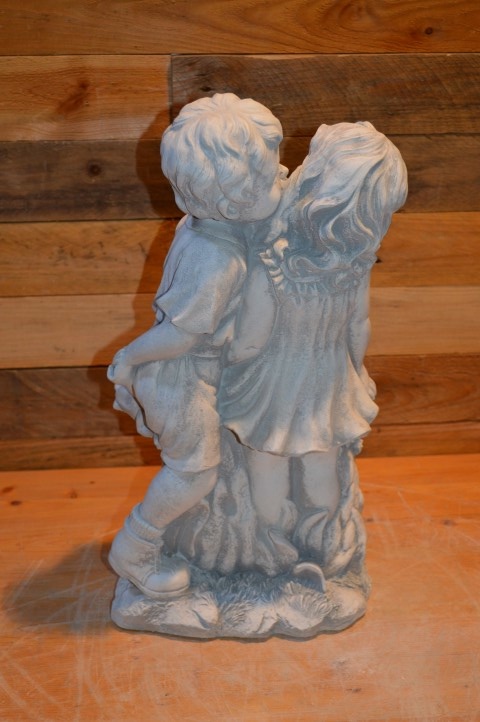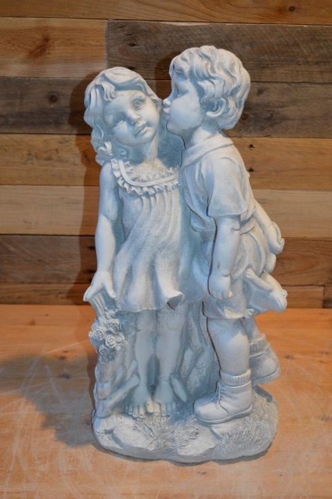Jongen met kikker geeft kusje is een speels en vertederend kinderbeeld van beton. De jongen buigt zich voorover om een meisje een kusje te geven, maar houdt stiekem een kikker op zijn rug – een ondeugende verrassing! Dit vrolijke tafereel is gedetailleerd vormgegeven en brengt humor en charme in elke tuin, hal of woonkamer. Gemaakt van stevig beton en geschikt voor binnen en buiten.