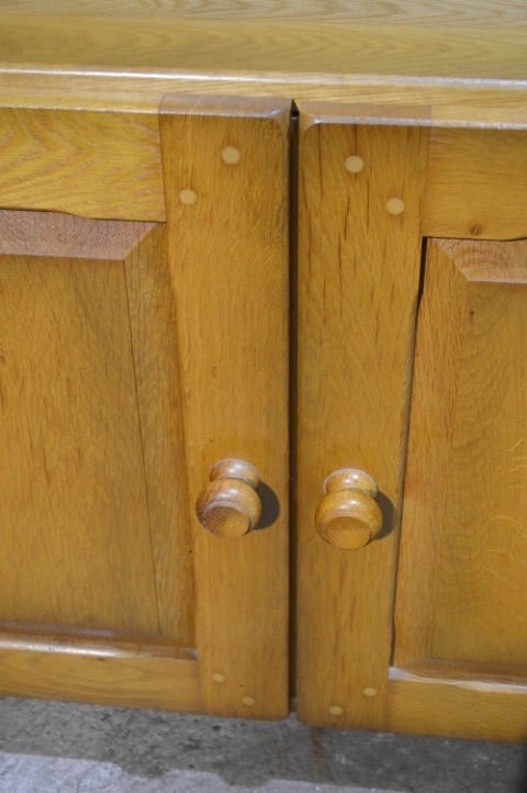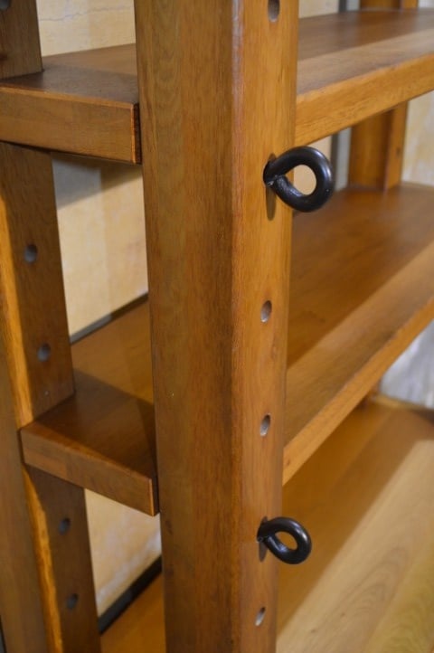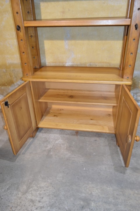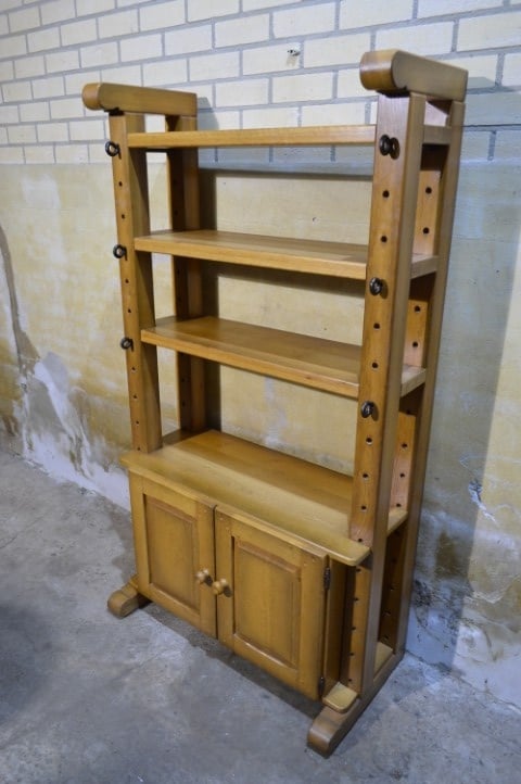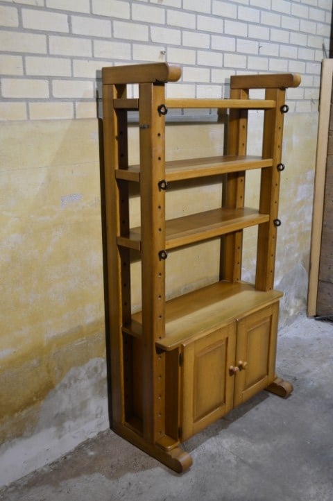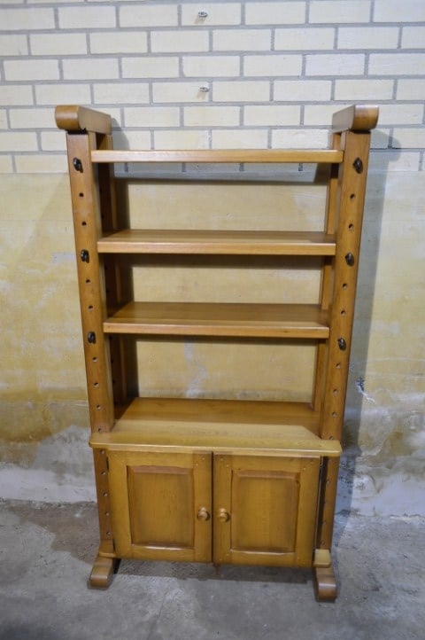 Een krachtige eiken kaaskast met een open en luchtige uitstraling. Vervaardigd uit zwaar eikenhout en uitgevoerd in een blanke tint met prachtige houtnerf. Het bovenste gedeelte biedt twee open legplanken; onderin zorgen twee deurtjes voor praktische opbergruimte. Mooi tegen de wand, maar ook perfect als roomdivider. Gebruikssporen passend bij de leeftijd geven de kast extra karakter.