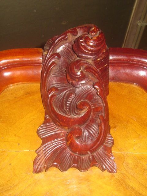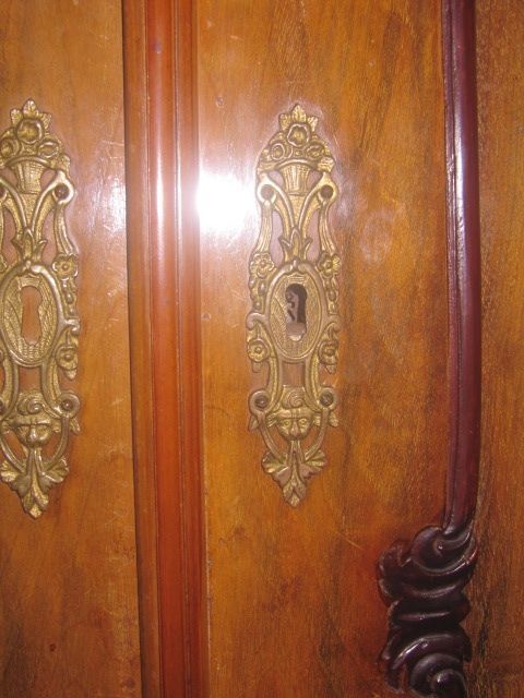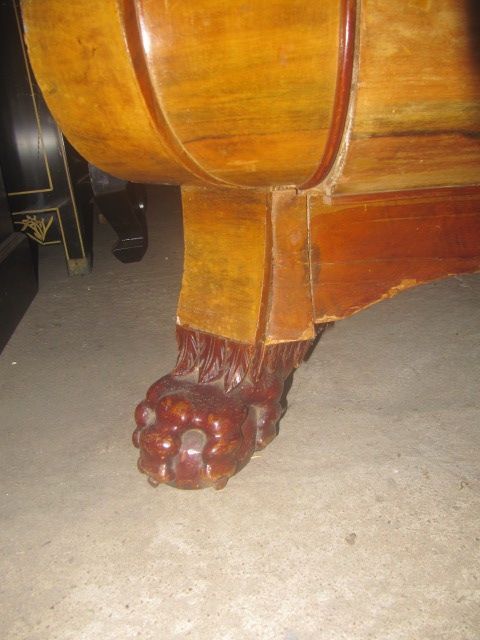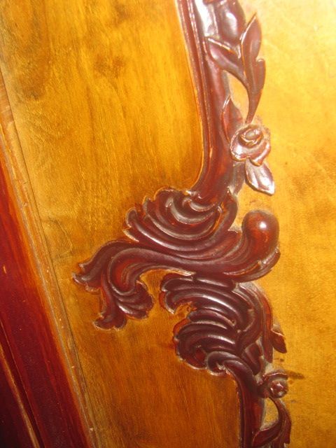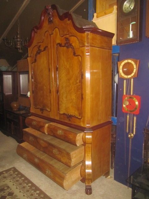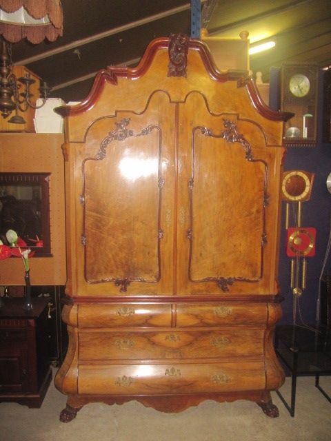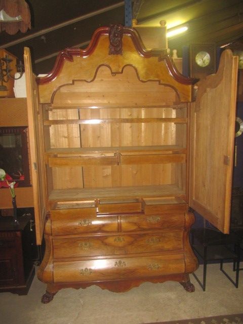 Dit antieke mahonie kabinet uit circa 1920 is een prachtig voorbeeld van vakmanschap. Het meubel biedt veel bergruimte met drie schappen, vijf lades en twee grote deuren, afgewerkt met sierlijk houtsnijwerk. De onderzijde heeft klauwpoten en een elegante kuif, waardoor het kabinet een echte blikvanger is in een grote kamer of hal. Ondanks enkele gebruikssporen door de tand des tijds blijft het meubel zeer charmant en waardevol voor liefhebbers van antiek.