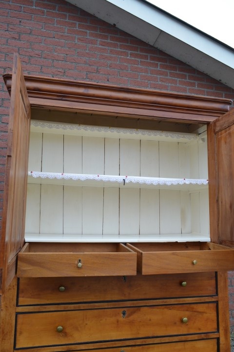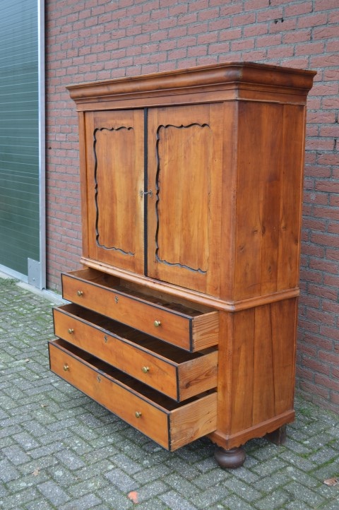 Biedermeier Kabinet met veel bergruimte voor in een mooie grote kamer of hal. Deze kersenhouten kast is rond 1920 gemaakt door een meubelmaker met grote klasse. Een antieke kast, waar vroeger het slaaplinnen en andere spullen in opgeborgen werd maar ook prima gebruikt kan worden als kledingkast of servieskast.