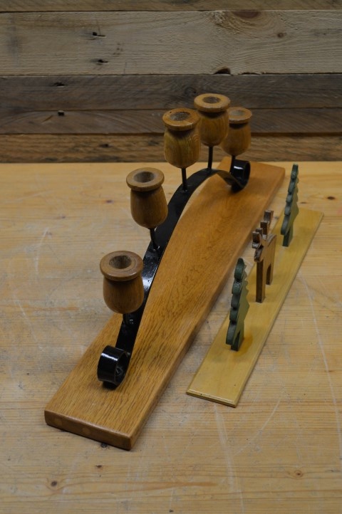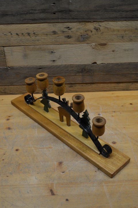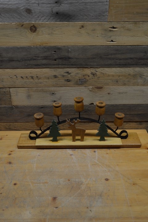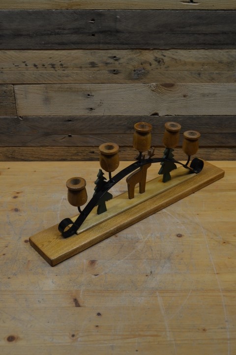 Deze decoratieve kandelaar met houten figuurtjes is een sfeervolle en robuuste blikvanger voor in huis. De vijf houten kaarsenhouders zijn gemonteerd op een stevig metalen frame. Onderaan bevindt zich een houten plankje met vaste houten beeldjes die een warme, huiselijke sfeer uitstralen. De kandelaar heeft lichte gebruikssporen; het plankje staat los, maar de figuurtjes zijn stevig bevestigd. Mooi als tafeldecoratie, op een kast of in de vensterbank – perfect voor wie houdt van een unieke en rustieke stijl.