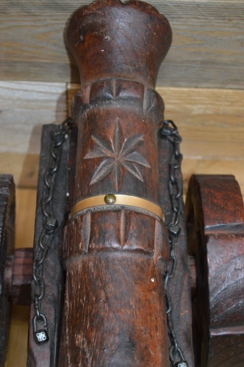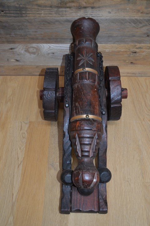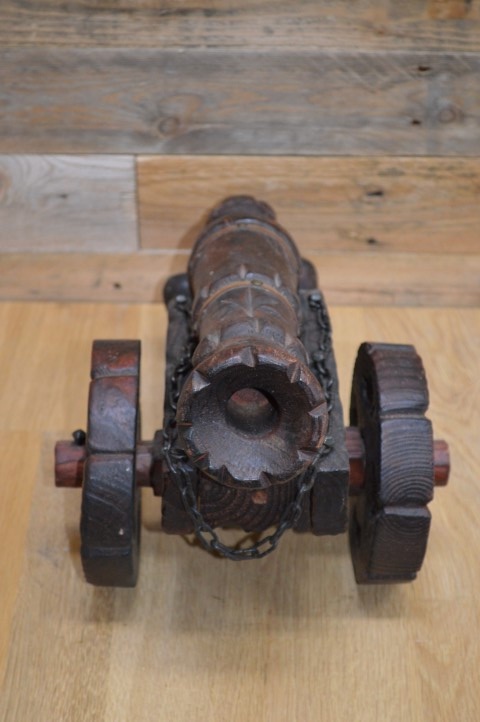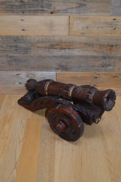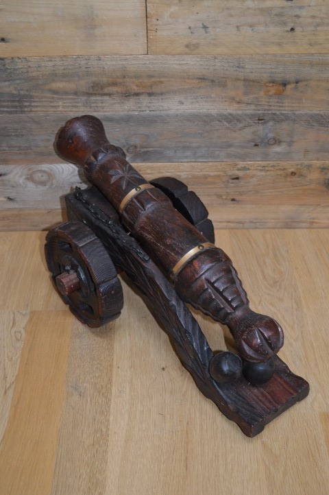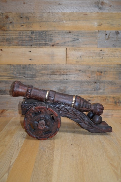 Houten kanon op massief houten wielen. Een groot met de handgesneden houten kanon op wielen en drie kanonballen. Decoratie uit de jaren 60 die op de bijzettafeltje of het dressoir gezet werd. Een mid century vintage kanon met messing ringen om de loop en wielen die met een spie vastgezet zijn.