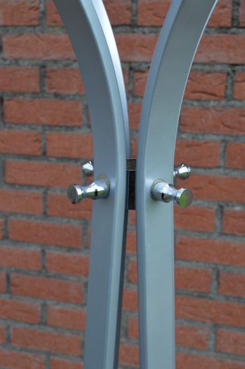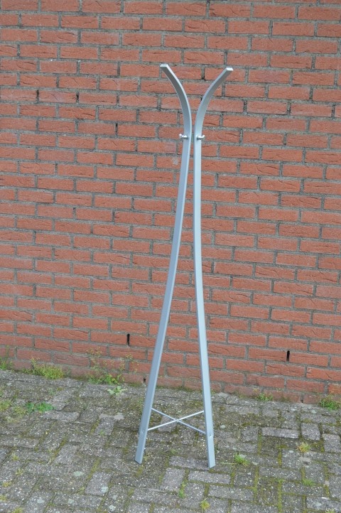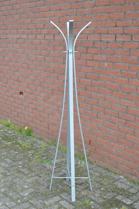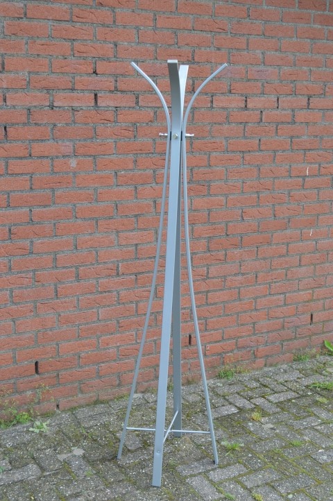 Een sierlijke staande kapstok met 8 haken om de jassen aan op te hangen. Gebogen metalen poten met op het gebogen stuk 4 haakjes om jassen aan op te hangen en bovenaan de poot kunnen ook jassen hangen of uw hoed of sjaal. Onderin de kapstok zit een kruis tussen de poten waardoor de kapstok zeer stabiel is.
