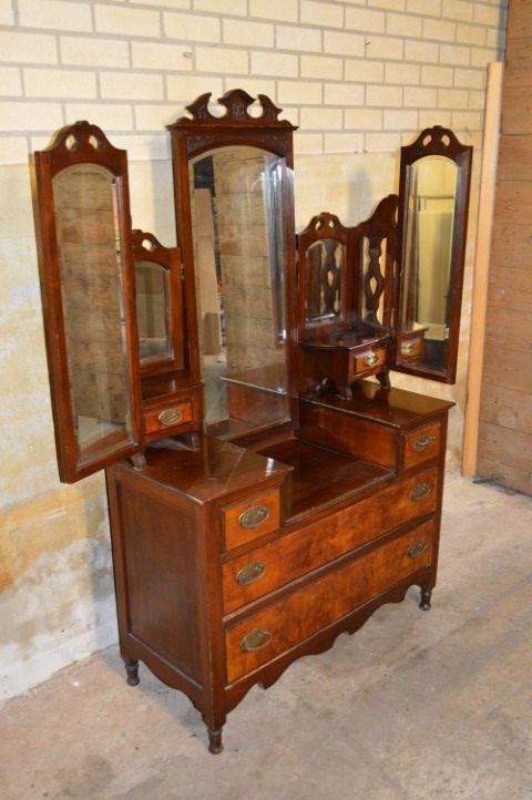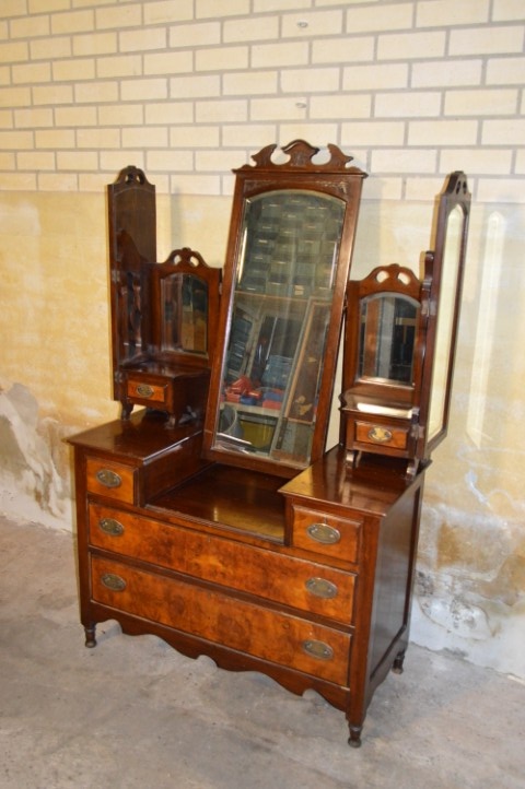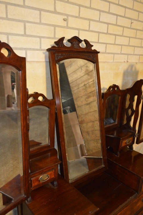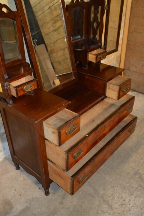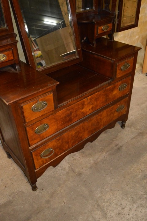 Prachtige Victoriaanse toiletkast van mahoniehout met wortelnoten fineer. Deze elegante Duchess-toiletkast is voorzien van een grote scharnierende spiegel, geflankeerd door twee schuine kastjes met sieradenvakjes. Aan weerszijden bevinden zich extra spiegels die kunnen worden uitgeklapt voor een volledig zicht.