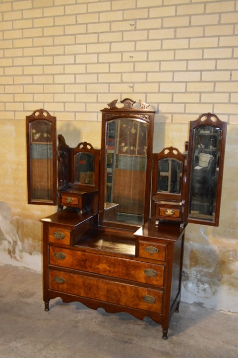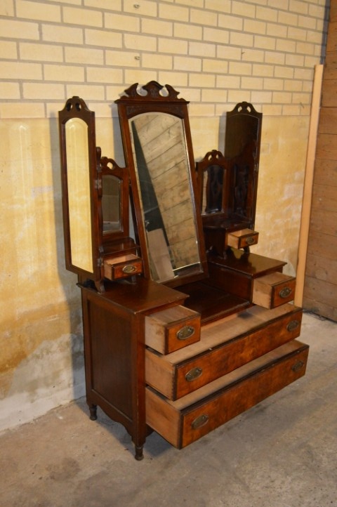 Het meubel verkeert in mooie staat voor zijn leeftijd, met lichte gebruikssporen passend bij zijn antieke karakter. Er zijn geen sleutels aanwezig. De combinatie van mahoniehout en wortelnoten fineer, samen met de elegante spiegelopbouw, maakt dit stuk tot een waar pronkstuk in elke klassieke of antieke slaapkamer. Perfect te combineren met bestaande antieke meubels of als blikvangend losstaand meubel.