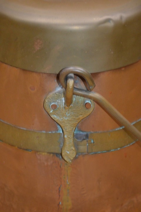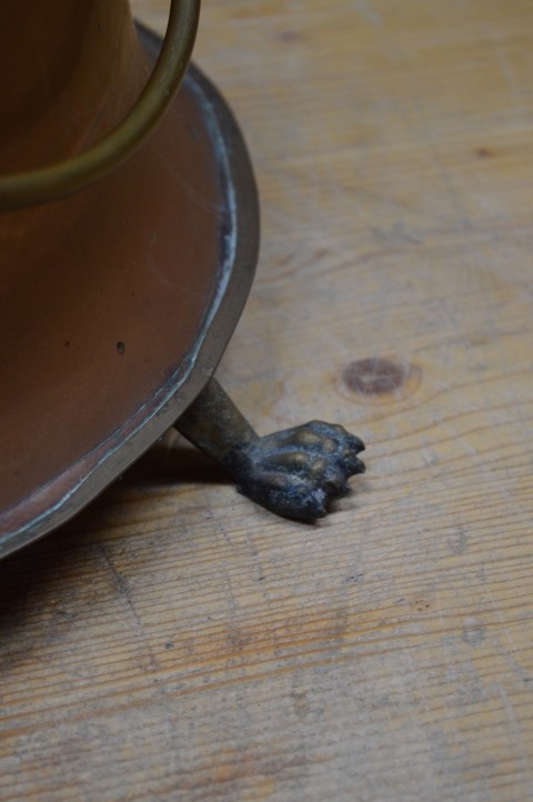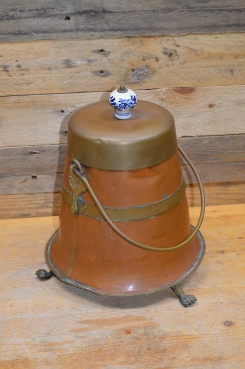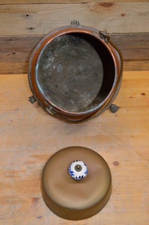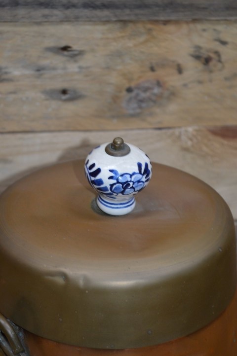 Deze doofketel van koper en messing met Delfts blauwe knop heeft een luchtdicht deksel waarmee vroeger de hete as uit de kachel werd gedoofd, maar is tegenwoordig ook erg leuk om als decoratie in huis te gebruiken, bijvoorbeeld naast de kast, bijzettafel of in de vensterbank.