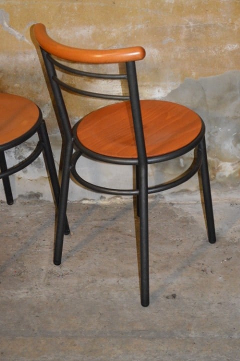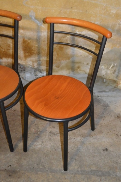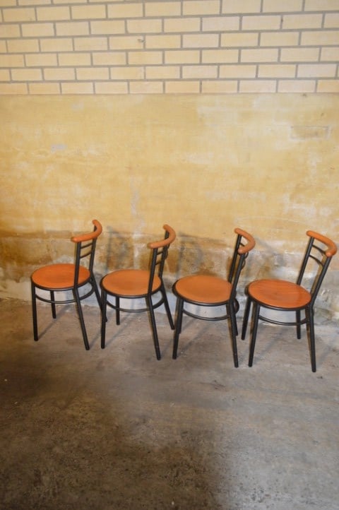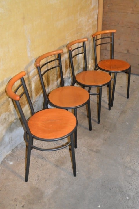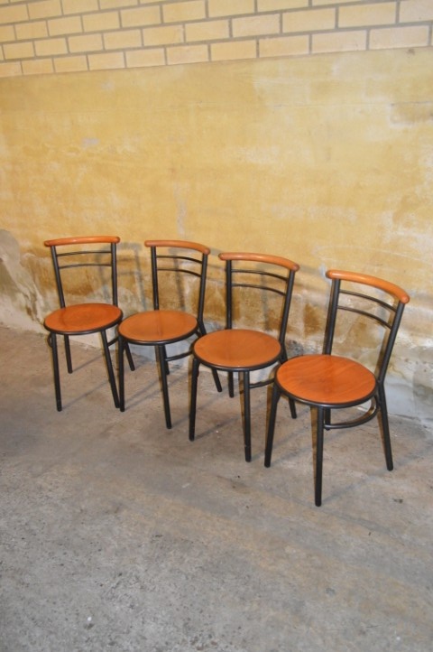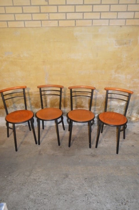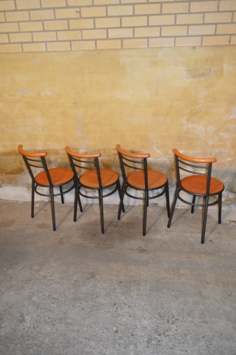Een set van 4 vintage keukenstoelen met metalen frame en houten accenten die functionaliteit en design combineren. Het stevige metalen onderstel zorgt voor stabiliteit, terwijl de houten zitting en rugleuning warmte en karakter toevoegen. Dankzij het stapelbare ontwerp zijn de stoelen praktisch in gebruik en eenvoudig op te bergen. Ideaal voor keuken, eetkamer of horecagebruik. De stoelen verkeren in gebruikte staat met lichte gebruikssporen passend bij de leeftijd. Worden uitsluitend als complete set van vier verkocht.