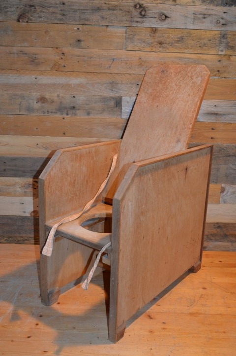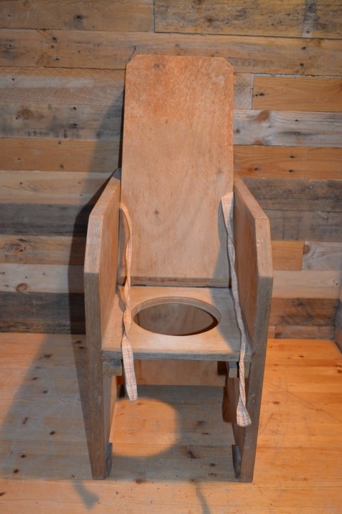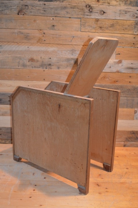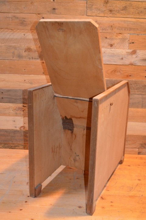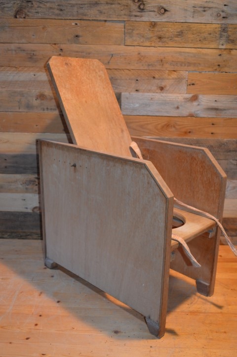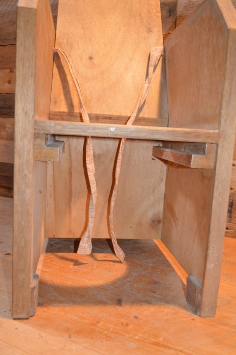 Retro zelfbouw kinderpostoel van hout in de trant van het model van een Rietveld stoel. Een zeer eigentijds model po stoel om je kind het gevoel te geven op een troon te zitten. Ook wel kindertroon genoemd. De houten stoel heeft een verstelbare rugleuning.
