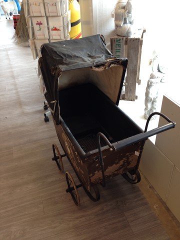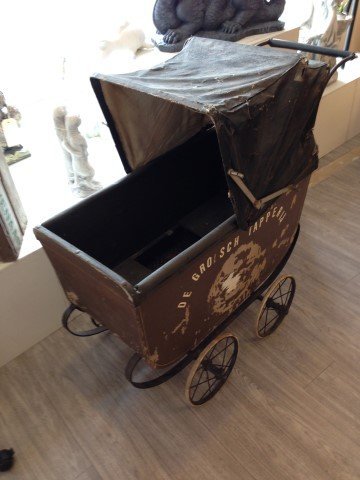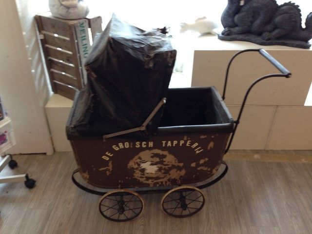 Deze antieke kinderwagen heeft een kap die aan twee kanten gebruikt kan worden, een houten bak met opbergvak en metalen wieltjes met massief rubberen bandjes. Op de zijkant is reclame van de Grolsch tapperij zichtbaar, een kenmerkend detail van vroeger. De kinderwagen is perfect als decoratie en vormt een mooie uitdaging voor restauratie-enthousiastelingen die hem weer in oude glorie willen herstellen.