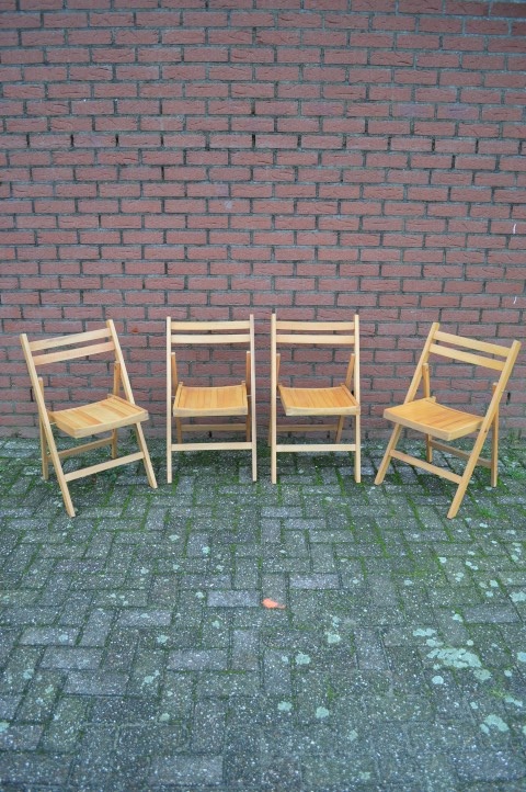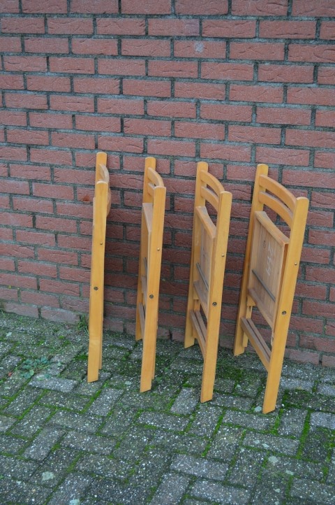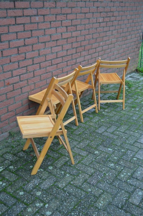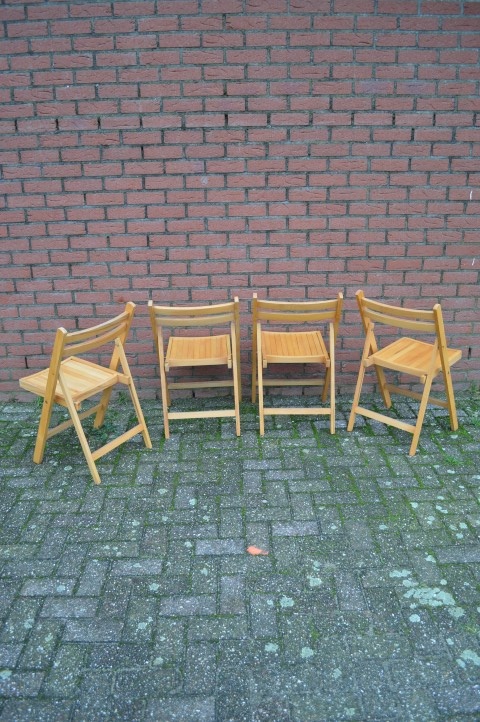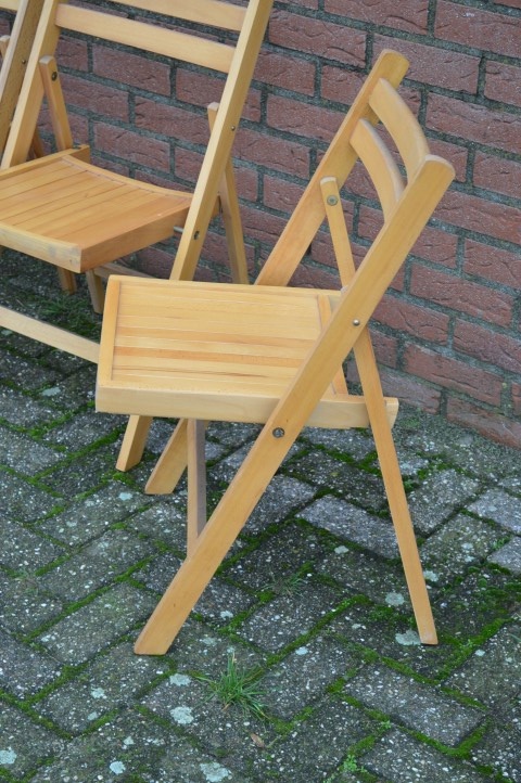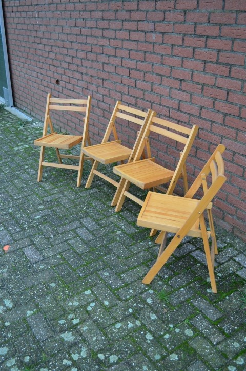 Mid Century Chair. Deze rustieke retro klapstoelen uit de jaren '70s zijn stevig, zitten goed en klappen makkelijk in. Dit setje bestaat uit 4 inklapbare stoelen. Mooie en stevige klapstoelen van beukenhout voor jaren plezier.