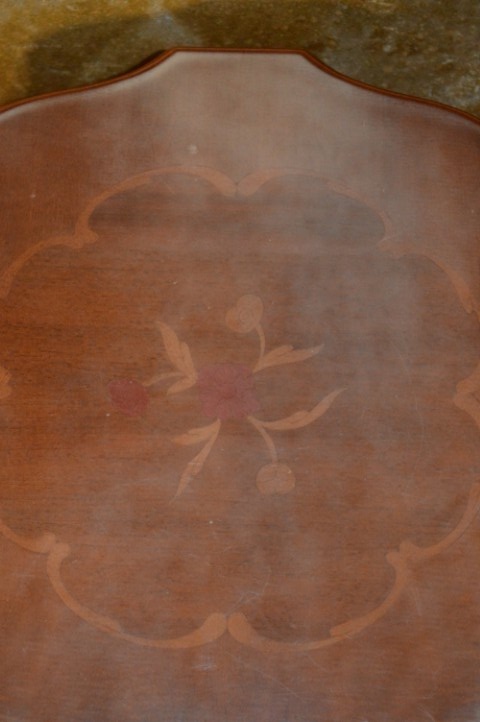 Dit mahoniehouten bijzettafeltje, ook wel wijntafeltje genoemd, heeft een geschulpt blad met een sierlijk ingelegd bloemenmotief en een gedraaide driesprantpoot.