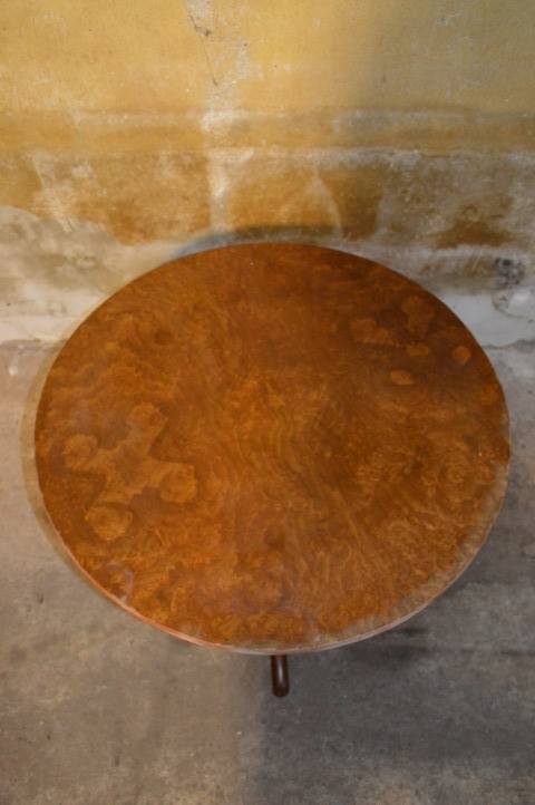 Het meubel vertoont gebruikssporen en de lak van het blad is matig, waardoor een nieuwe laklaag aan te raden is. Desondanks blijft het een prachtig en karaktervol tafeltje dat gegarandeerd de aandacht trekt.
