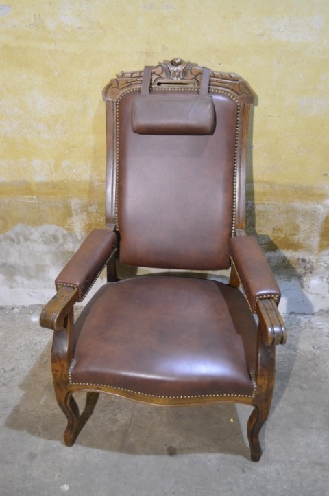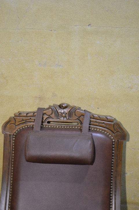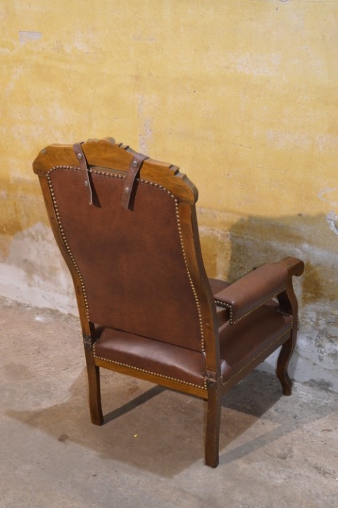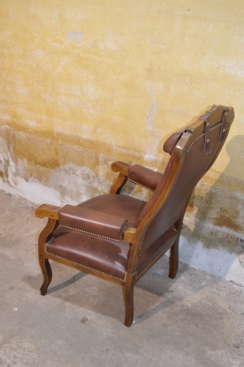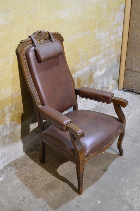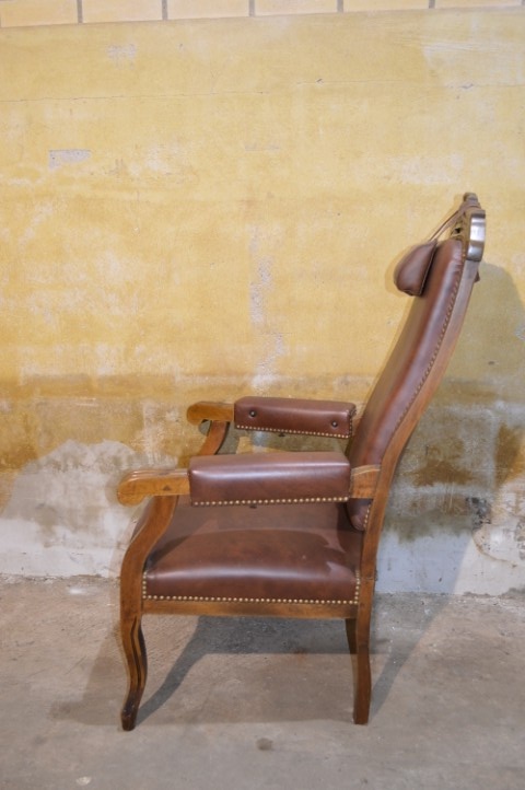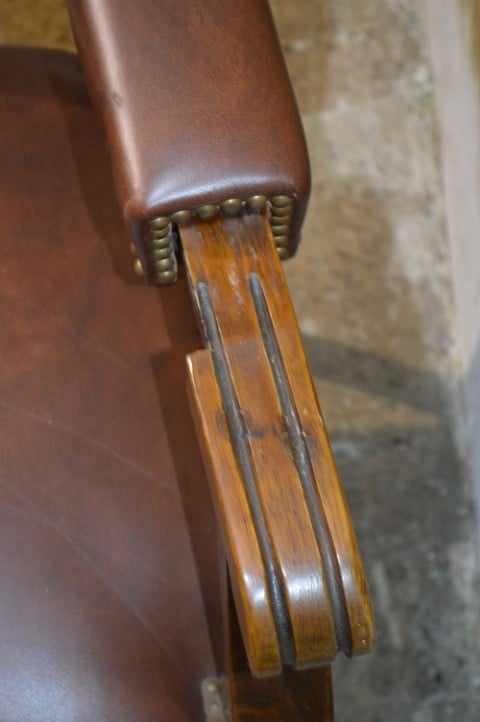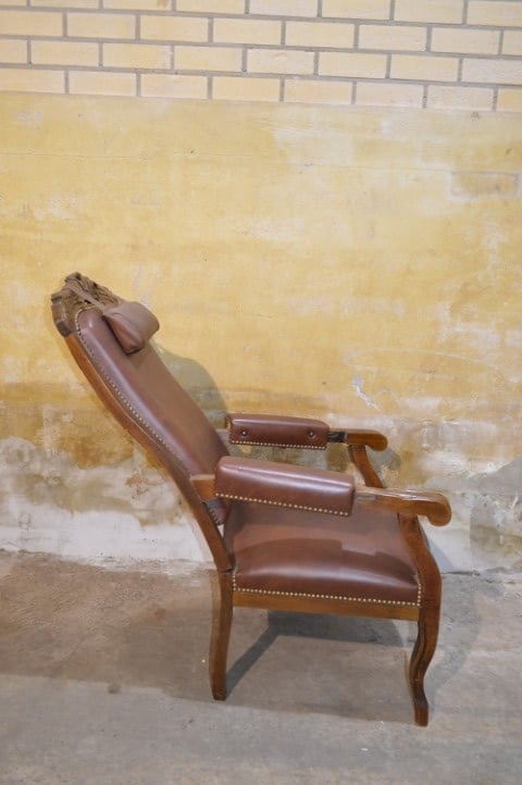 De decoratieve nagels en het sierlijke houtsnijwerk geven de fauteuil extra karakter en versterken het klassieke ontwerp. Een bijzonder detail is de verstelbare rugleuning, wat voor de periode waarin deze fauteuil gemaakt werd uitzonderlijk is en extra comfort biedt.