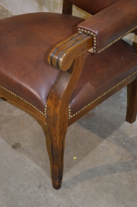 Deze klassieke fauteuil is een prachtig meubelstuk met een rijke en stijlvolle uitstraling. De stoel heeft een stevig houten frame en is bekleed met donkerbruin leer, wat zorgt voor een warme en luxe uitstraling.