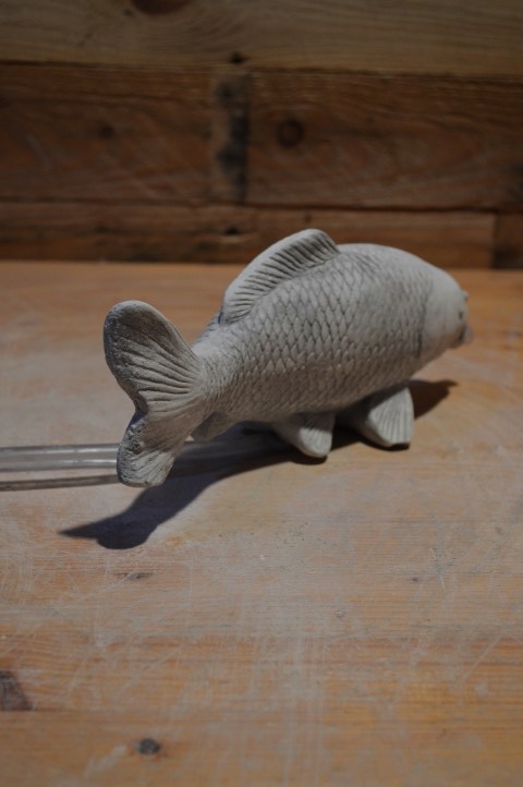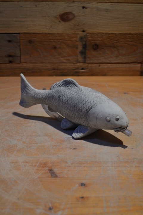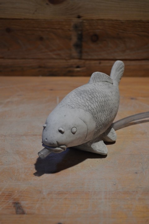Kleine Koi met waterslang is een prachtig betonnen vijverbeeld van een Nishikigoi, ook wel brokaatkarper genoemd. Dit beeld heeft een slang in de bek waarmee water kan worden doorgevoerd, bijvoorbeeld vanuit een pomp – ideaal om water te laten stromen in een vijver of waterschaal. De Koi is natuurgetrouw vormgegeven en zorgt voor een levendig accent langs de rand van uw vijver. Het beeld is gemaakt van duurzaam beton en ook verkrijgbaar in een groter formaat.